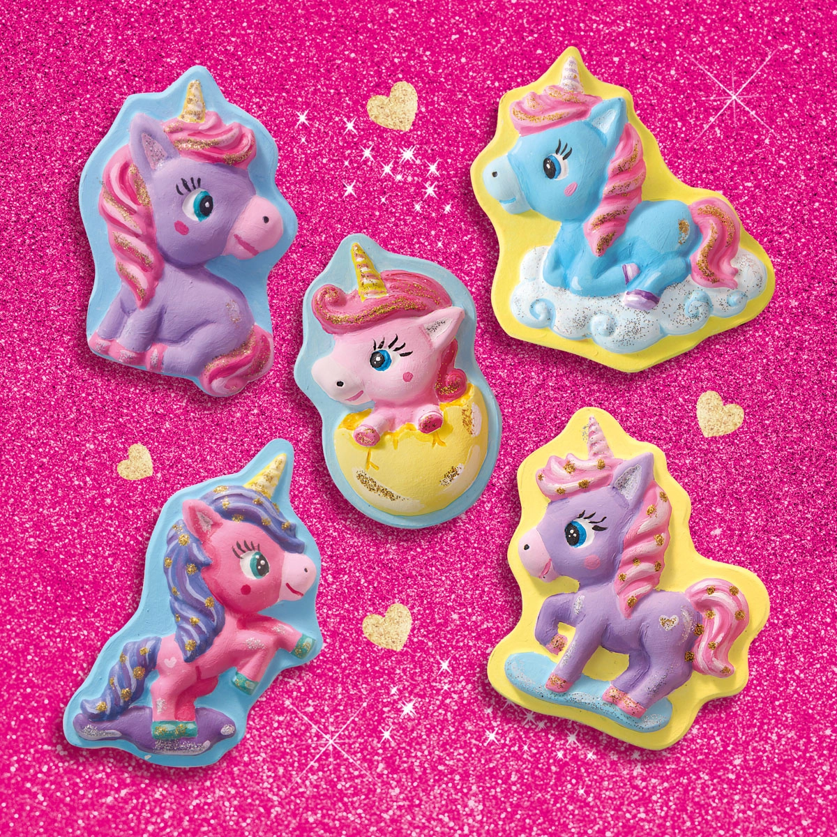 Laat de fantasie tot leven komen en maak je eigen collectie betoverende eenhoornveulens. Dankzij de praktische mal en de fijne gips kunnen ook beginners gemakkelijk gieten. Versier de figuurtjes daarna met levendige kleuren of meng ze tot zachte pasteltinten. Voor de schitterende finishing touch zorgt de goud- en zilverkleurige glitterlijm.