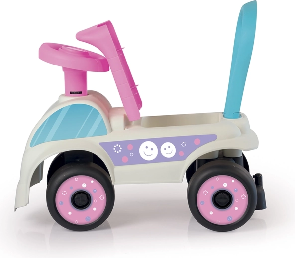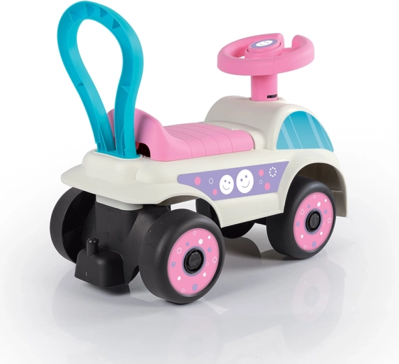 De stijlvolle kinderloopauto in wit-roze is ontworpen voor veilig ontdekken, zowel binnen als op het terras. Dankzij de lage zithoogte kunnen kinderen zich gemakkelijk met de voetjes afzetten, hun evenwicht oefenen en stap voor stap meer zelfvertrouwen krijgen in hun beweging. De achterhandgreep biedt ouders houvast en kinderen steun bij de eerste stapjes.