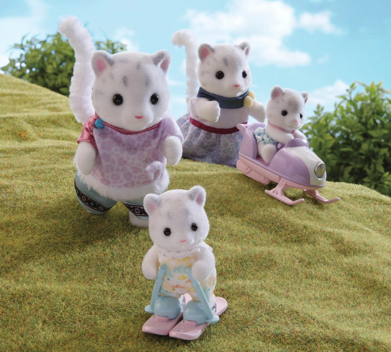 Deze fijn afgewerkte sneeuwpanterfamilie maakt zowel kinderen als verzamelaars blij. Mama, papa en twee kittens hebben een zachte, geflockte textuur en karakteristiek lange staarten. Dankzij de winteraccessoires kunnen kinderen actievolle sneeuwverhalen bedenken, op de scooter rijden of de kittens leren skiën.