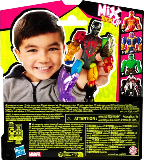 De figuur biedt 16 bevestigingspunten en universele connectors die compatibiliteit binnen de hele Mix+Mashers-lijn garanderen. Zo krijg je miljoenen creatieve mogelijkheden om je eigen superheld samen te stellen – van een felle power kick met de paarse klauw tot repulsor-uitrusting in Iron Man-stijl.