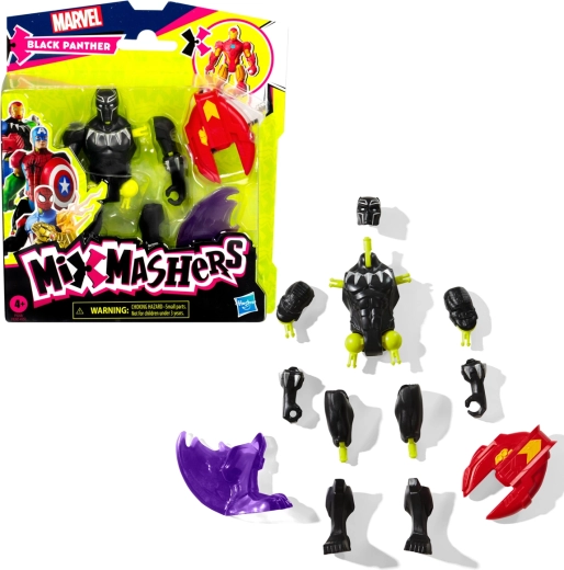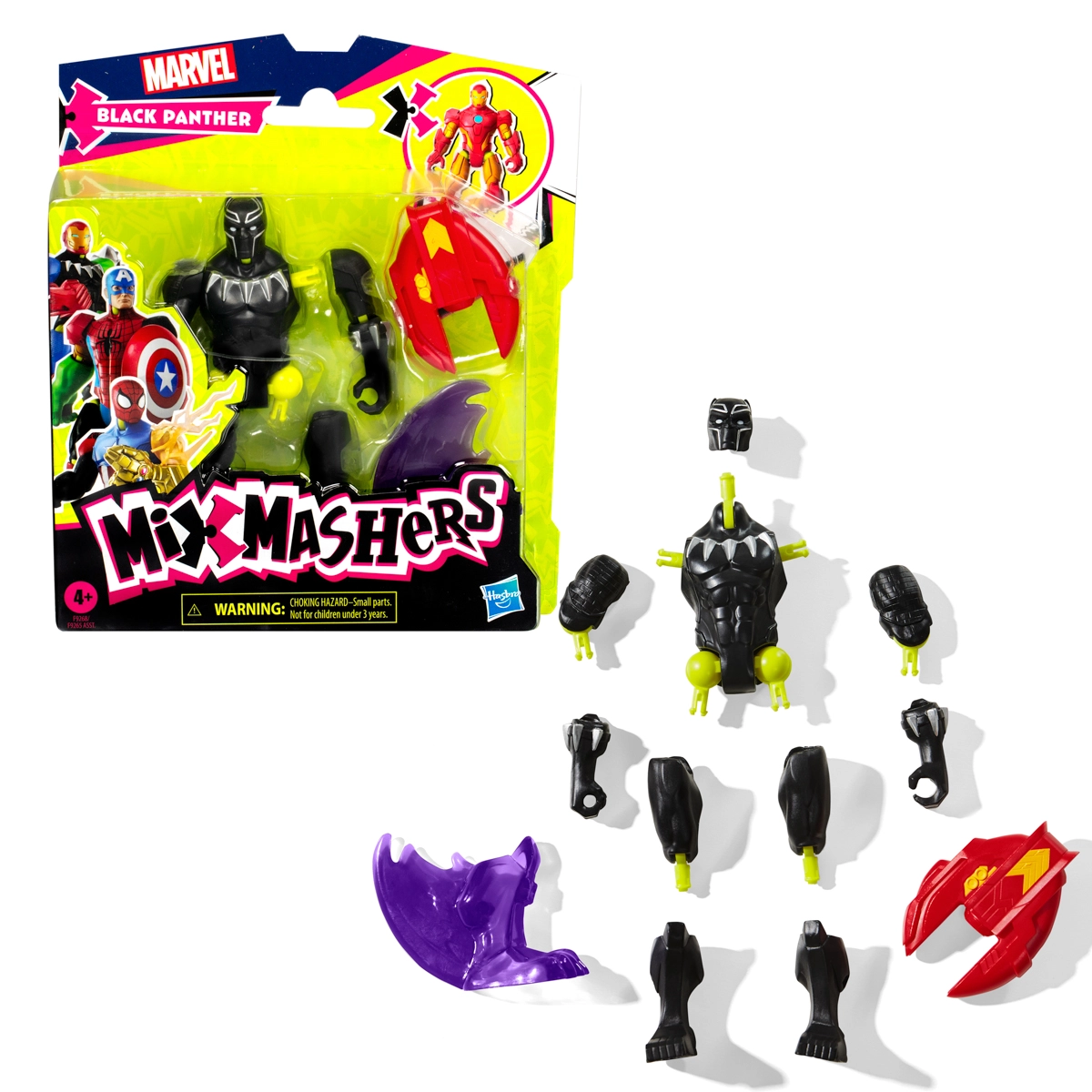 Ontdek de wereld van MARVEL-helden met de 12 cm Black Panther-figuur uit de Hasbro Mix+Mashers-serie. Dankzij het systeem met verwisselbare delen kun je armen, benen en accessoires eenvoudig los- en vastklikken, onderling mixen en zo unieke actiecombinaties creëren.
