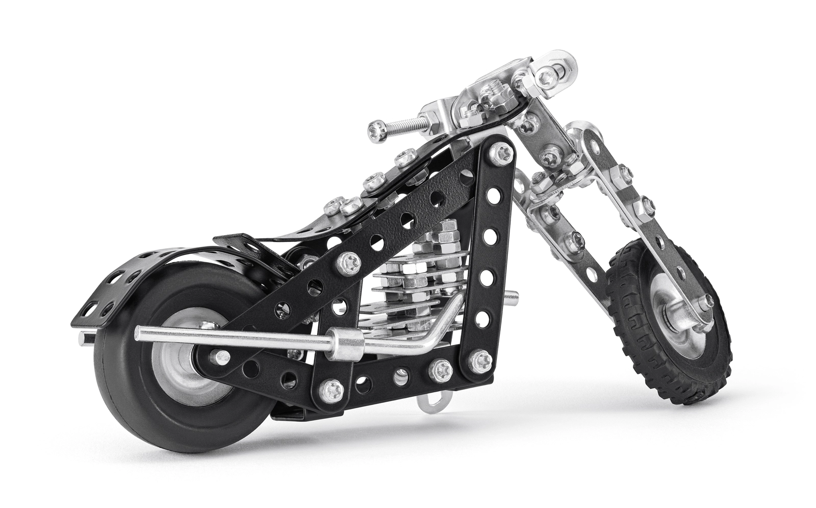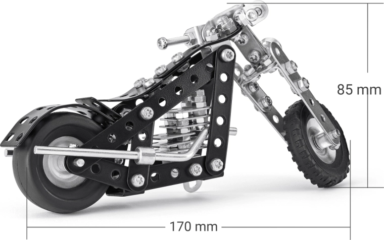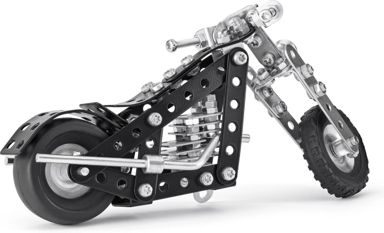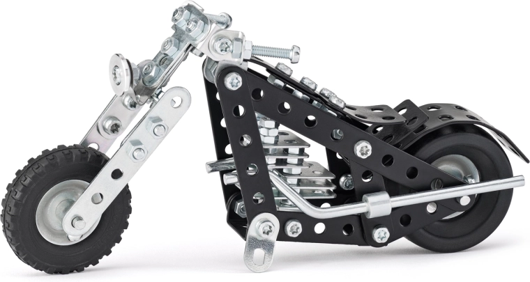 Ontdek de leuke metalen bouwset MERKUR waarmee kinderen een stijlvolle chopper kunnen bouwen. De set bevat 163 onderdelen, is eenvoudig te monteren met schroefjes en stimuleert fijne motoriek, logisch denken en geduld. Ideaal voor jonge techneuten vanaf 5 jaar met moeilijkheidsgraad 2,5.
