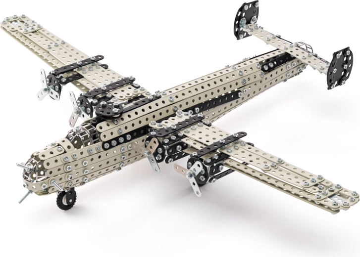 Vier 100 jaar van de legendarische MERKUR-bouwset met de gelimiteerde editie van het model B-24 Liberator. De set met 902 onderdelen biedt een indrukwekkend model van een bommenwerper met een vleugelspanwijdte van 55,5 cm, hoogwaardige metalen componenten, een gedetailleerde brochure met het verhaal en een genummerd certificaat. De moeilijkheidsgraad level 5 is perfect voor enthousiaste bouwers vanaf 8 jaar (bij voorkeur met begeleiding van een volwassene).
