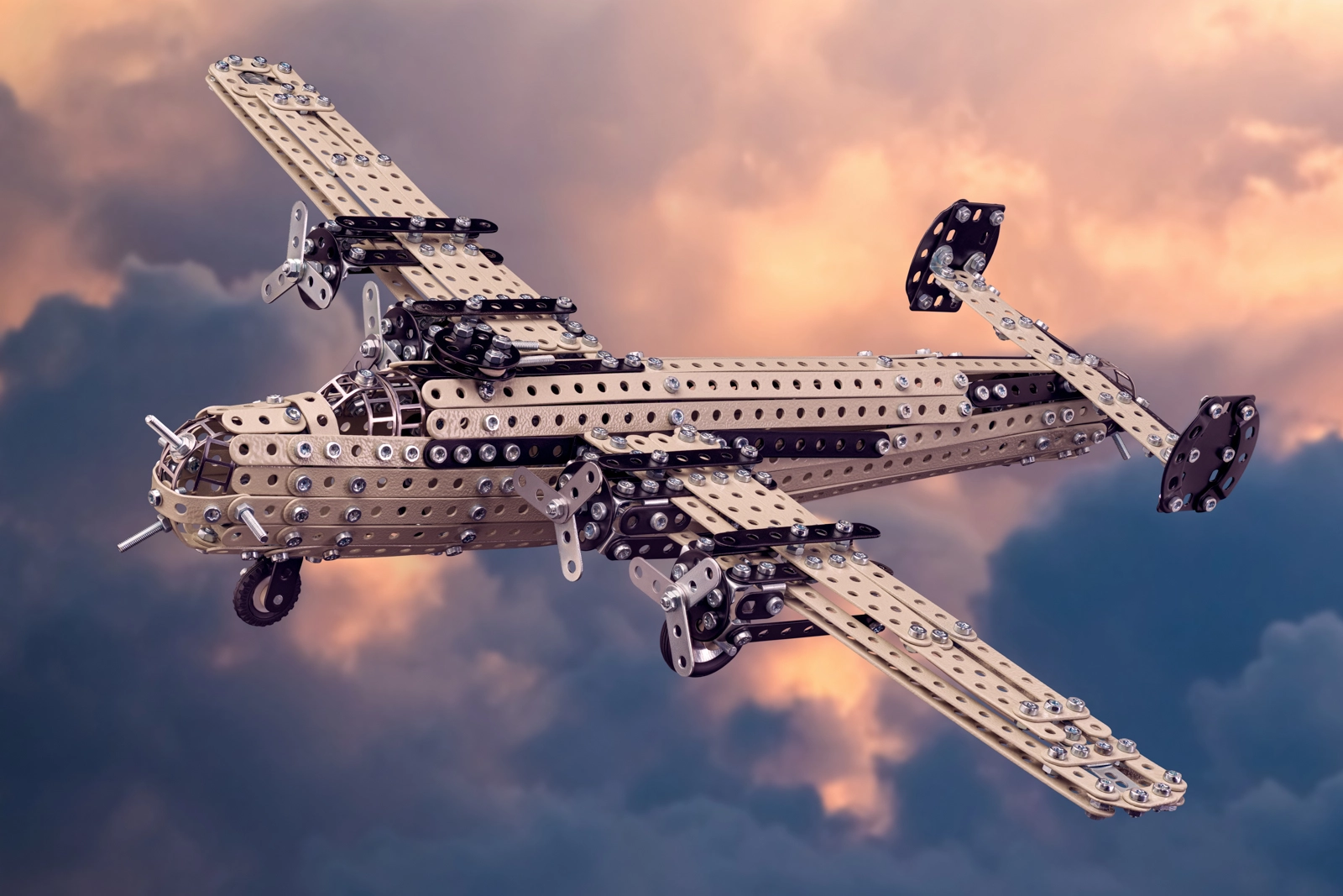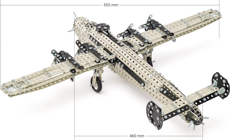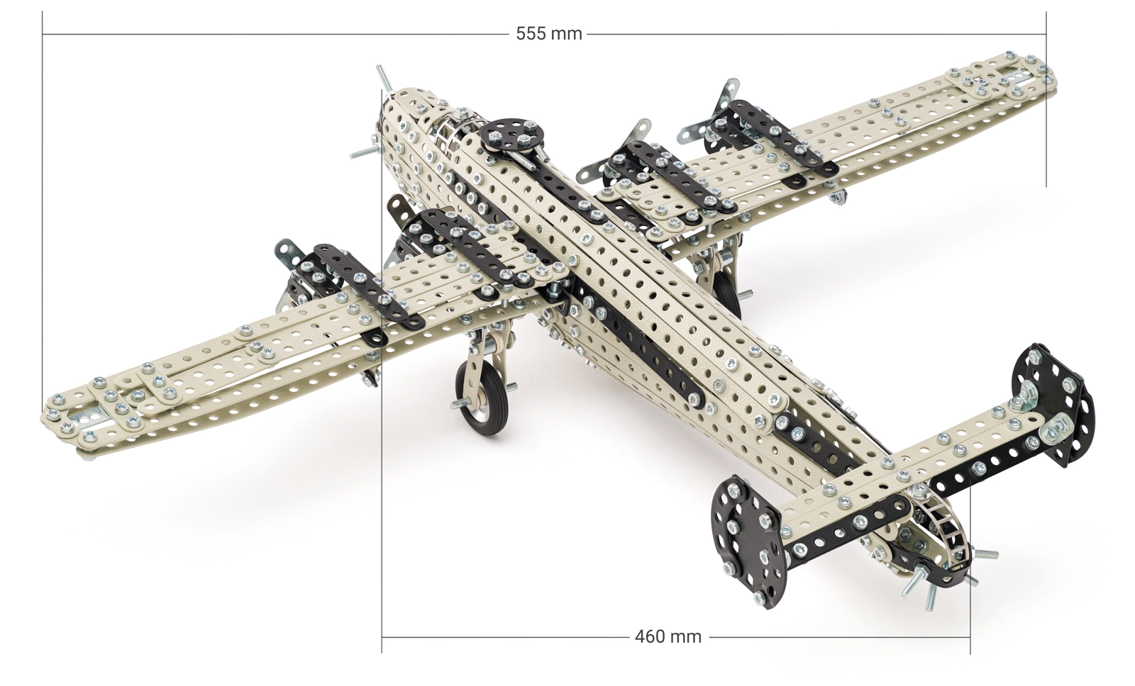 Geperforeerde strips, platen en bevestigingsmateriaal vormen een stevig model met werkende details van het landingsgestel en de propellers. Ideaal om te bouwen en tentoon te stellen.