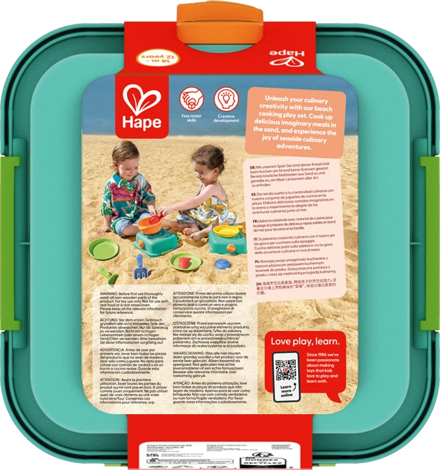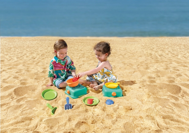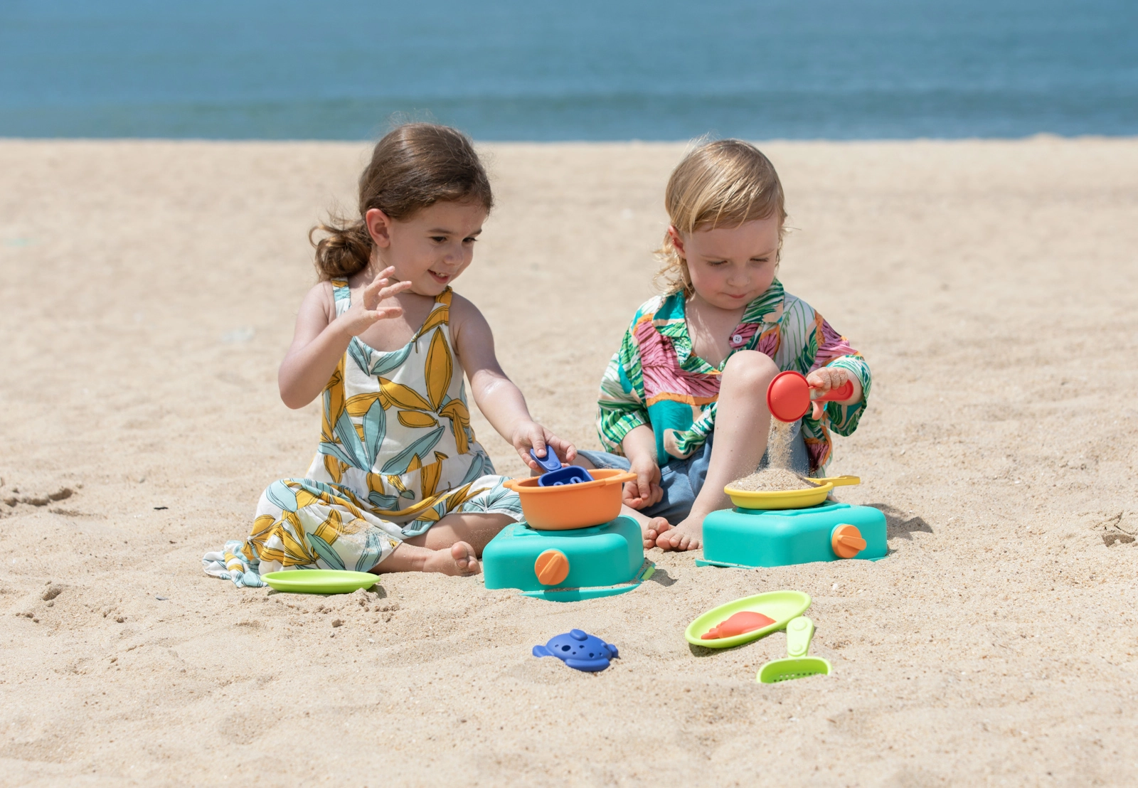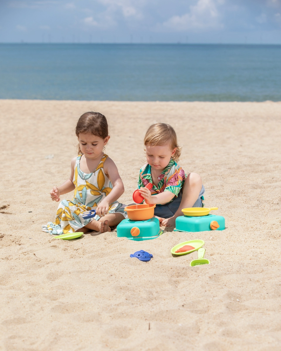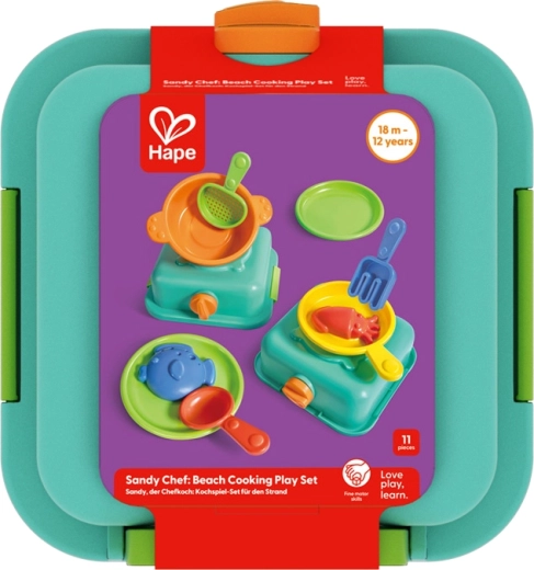 Alles wat een kleine chef nodig heeft voor op het strand: twee “kookplaten”, een koekenpan, een steelpan, bordjes en vormpjes van een vis en een inktvis. Kinderen kunnen zand scheppen, zeven en vormen en zo de hand-oogcoördinatie ontwikkelen. De onderdelen zijn van duurzaam plastic met gladde randen voor veilig spelen.