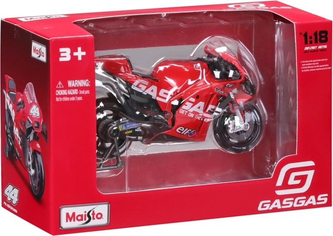 Gedetailleerd verzamelmodel van de racemotor GASGAS Factory Racing Tech3 2023 op schaal 1:18 met nummer 44 – Pol Espargaró. Metalen carrosserie met kunststof onderdelen, vrij draaiende wielen en een standaard voor presentatie. Officieel gelicentieerd product, natuurgetrouwe kleuren en preciese afwerking van details.
