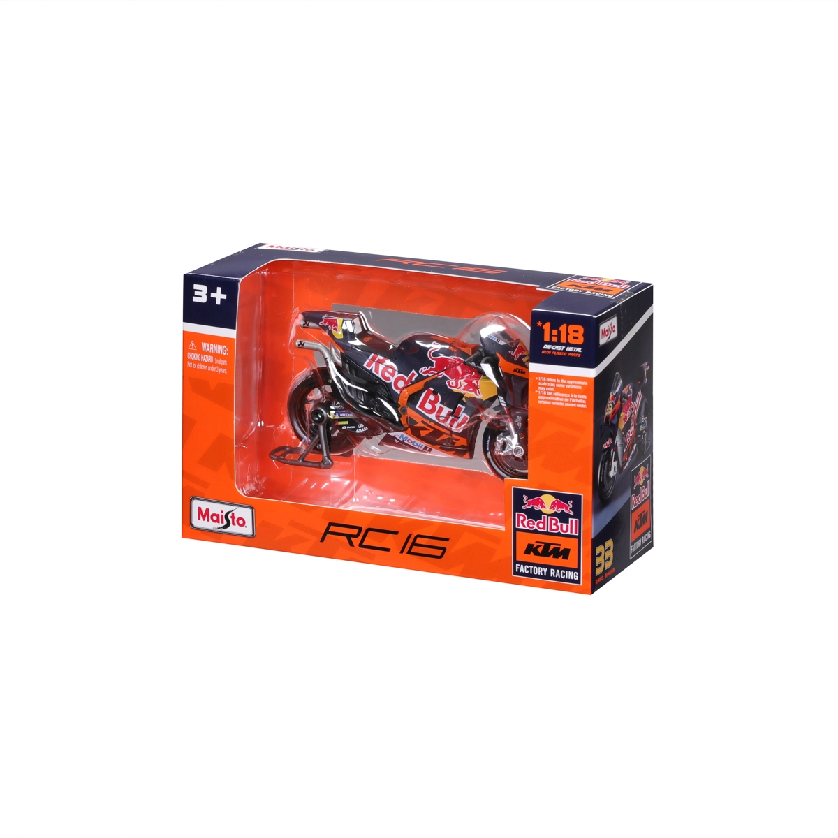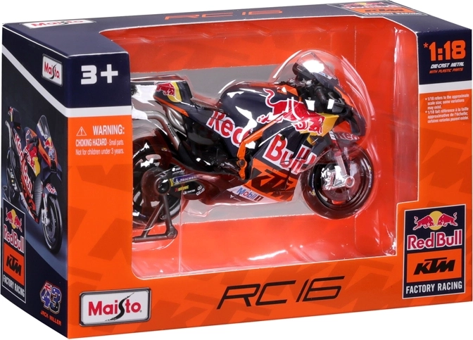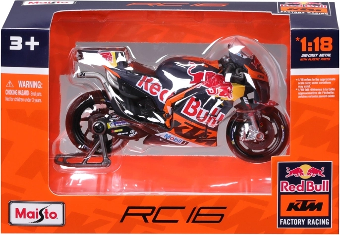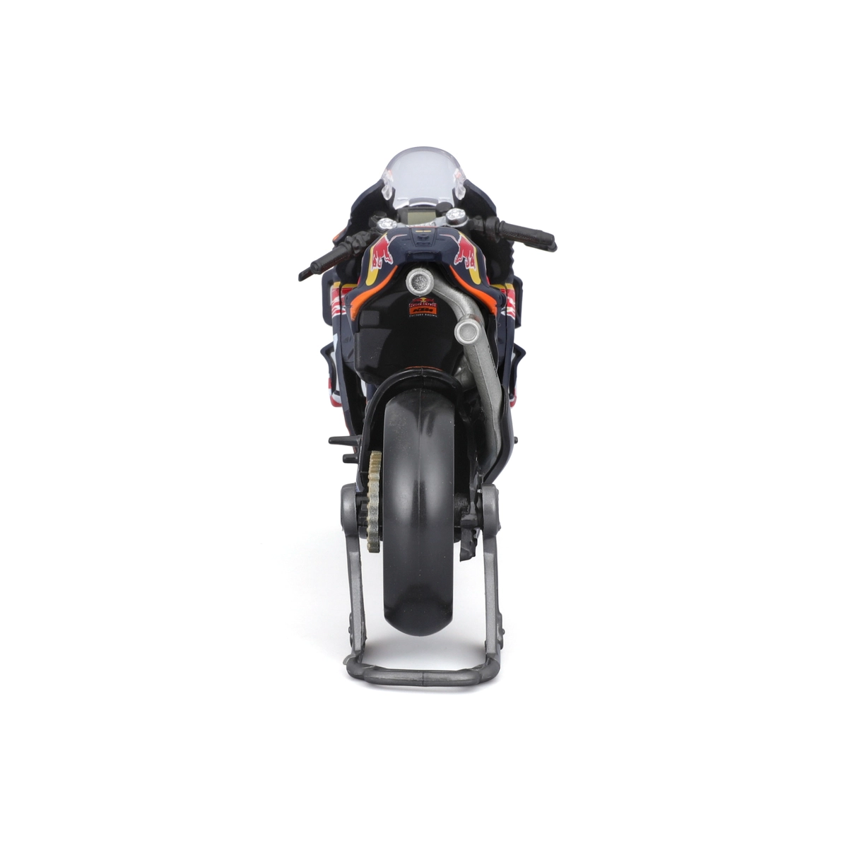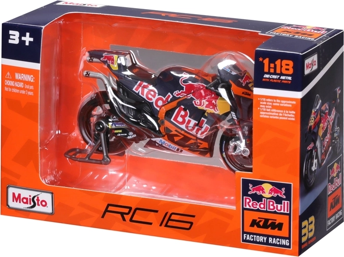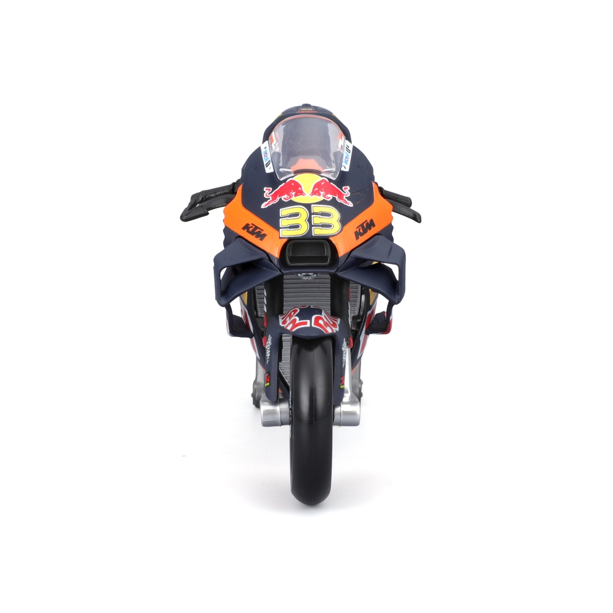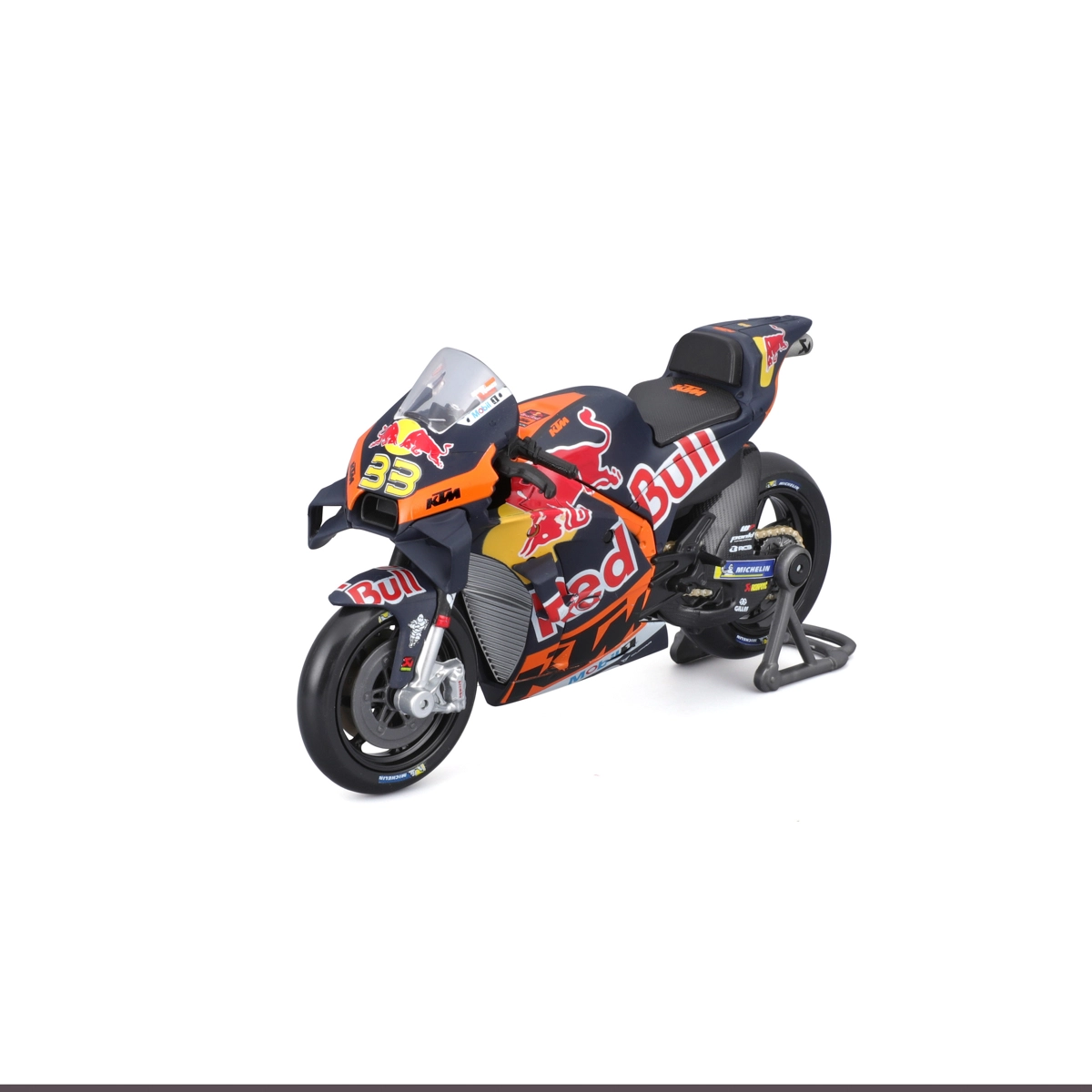Dankzij de draaibare wielen en details zoals remschijven, uitlaat, stuur en het transparante voorruitje oogt het model maximaal realistisch. Er wordt ook een paddock-standaard meegeleverd voor een stabiele presentatie. De officiële licentie garandeert de exacte kleuren en graphics van het RED BULL KTM-team met het startnummer 33.