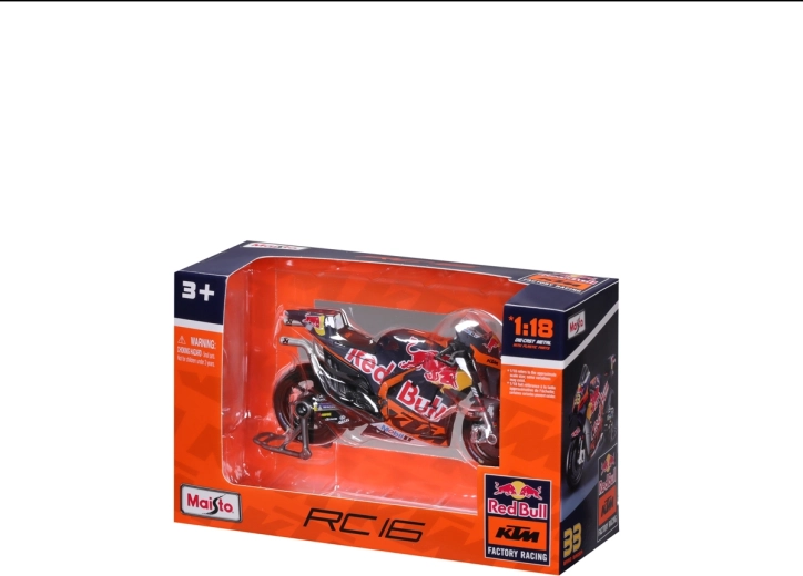 Beleef de MotoGP-adrenaline met het gedetailleerde model van de Red Bull KTM Factory Racing RC16 2023 op schaal 1:18. Dit officieel gelicentieerde model van metaal met kunststof details biedt precisie-afwerking, vrij draaiende wielen en een paddockstandaard voor stabiele presentatie. Ideaal voor verzamelaars en jonge racers vanaf 3 jaar.