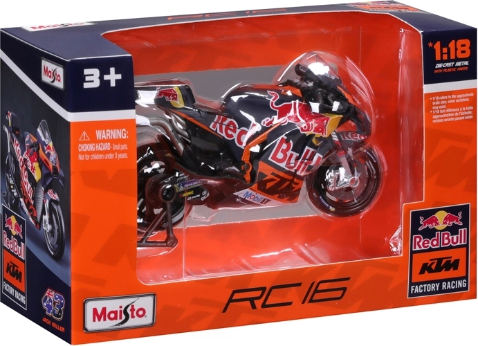 Dit realistische model van MAISTO toont de racespecial KTM RC16 in Red Bull-kleuren voor het seizoen 2023 met startnummer 43 – Jack Miller. Dankzij de hoogwaardige metalen body, nauwkeurige sponsorbedrukking en functionele details oogt het als een verkleinde versie van een echte MotoGP-machine.