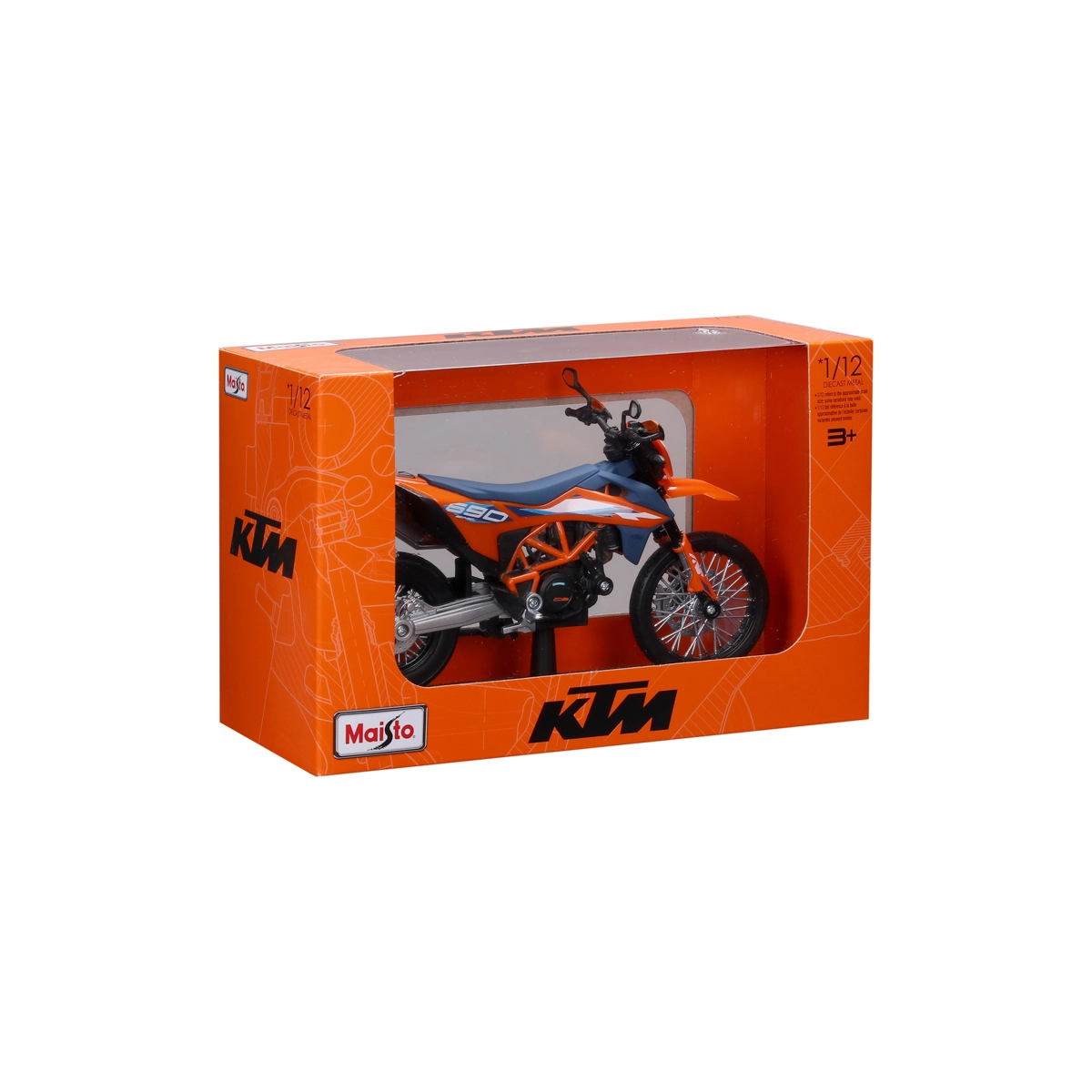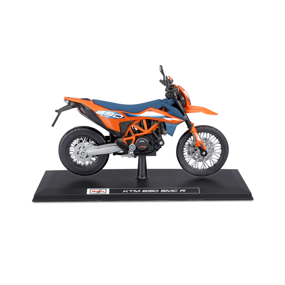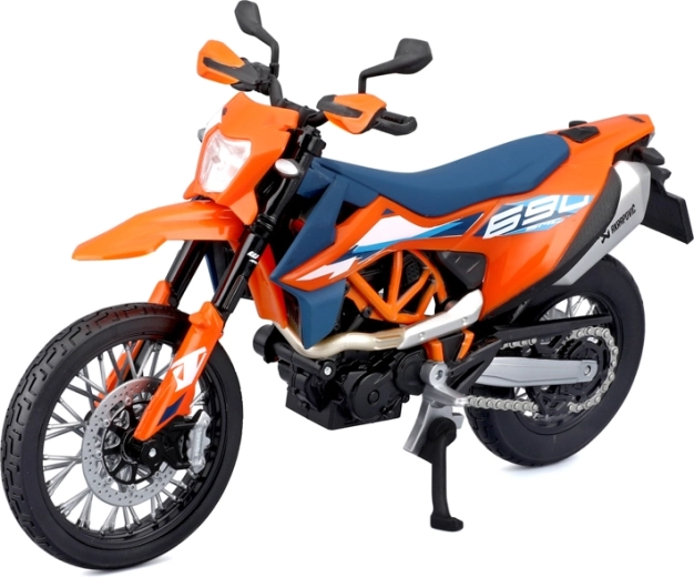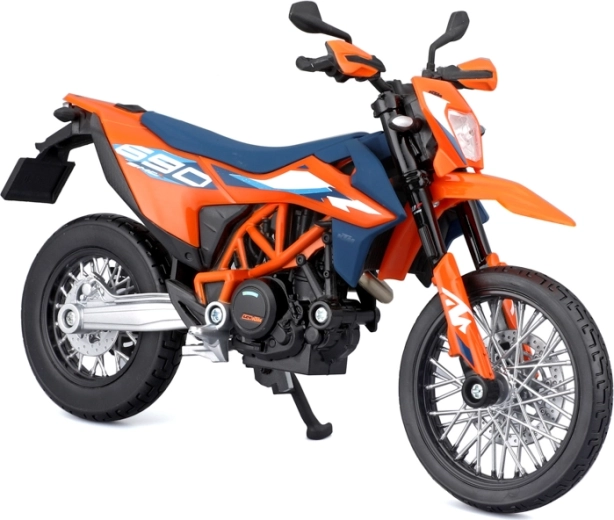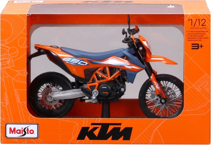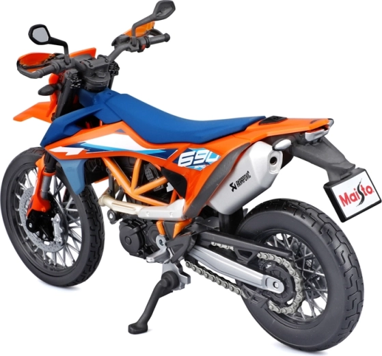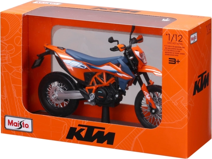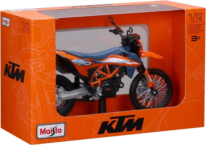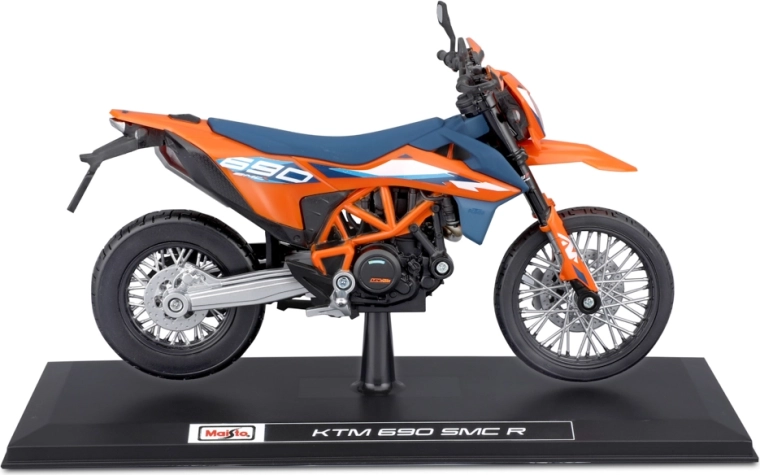 Gedetailleerd verzamelmodel van de motor KTM 690 SMC R (2023) op schaal 1:12 van het merk Maisto. Biedt metalen uitvoering met kunststof details, geveerde achteras, bewegbare zijstandaard en vrij draaiende wielen voor realistisch tentoonstellen en spelen.