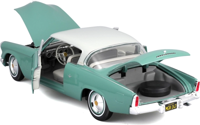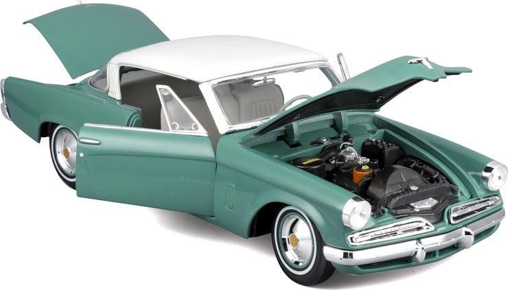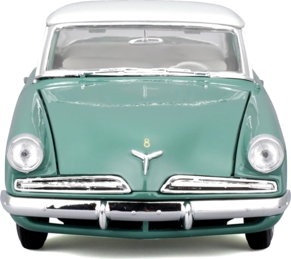 Het iconische model van de 1953 Studebaker Starliner op schaal 1:18 van het merk Maisto overtuigt met zijn realisme en hoogwaardige afwerking. Metalen uitvoering met kunststofdetails, te openen delen, functionerende besturing en vering op alle vier de wielen maken van dit stuk een geweldig verzamelmodel in een elegante groene kleur.