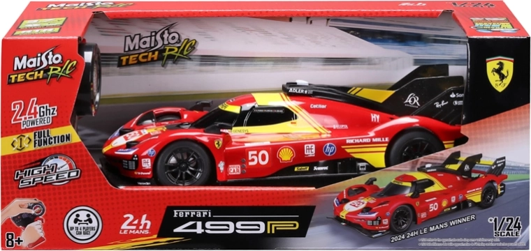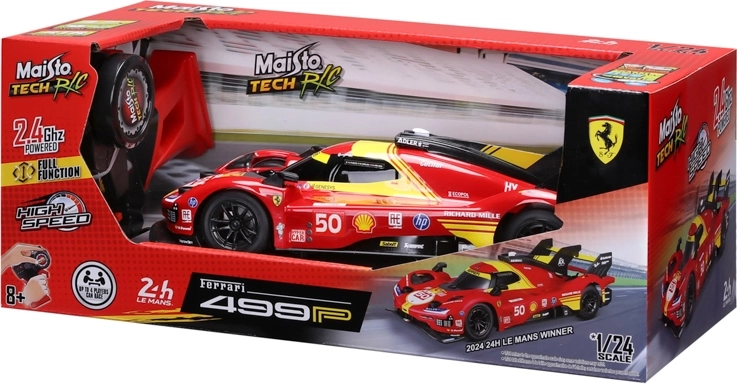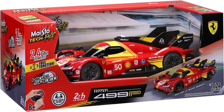 Beleef de racesfeer met de volledig gelicentieerde FERRARI 499P – een endurance‑prototype en kampioen van de 24H LE MANS 2024. Dit gedetailleerde RC‑model op schaal 1:24 biedt soepele bediening, realistische proporties en uitstekende rijeigenschappen voor thuiscircuits en buiten.