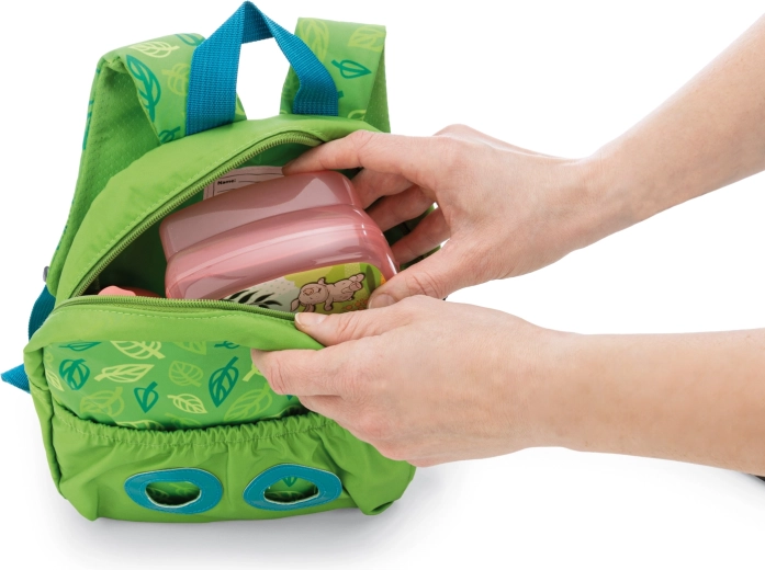 Het hoofdvak met rits biedt plek voor een snack, fles en kleine speeltjes. Het voorvak met elastiek houdt de knuffel veilig op zijn plaats.