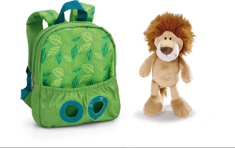 Op zoek naar een praktische en speels schattige rugzak voor kleine avonturiers? De groene NICI-rugzak met bladpatroon combineert functionaliteit en plezier – kinderen nemen hun spulletjes én hun favoriete pluchen leeuw (25 cm) mee, die vastzit in het elastische voorvak en hen bij iedere stap kan “vergezellen”.