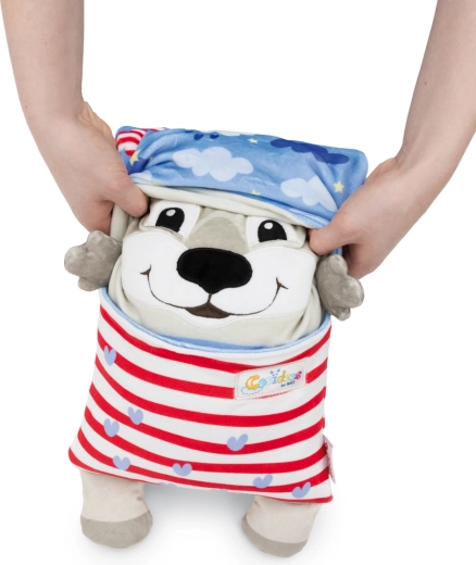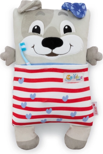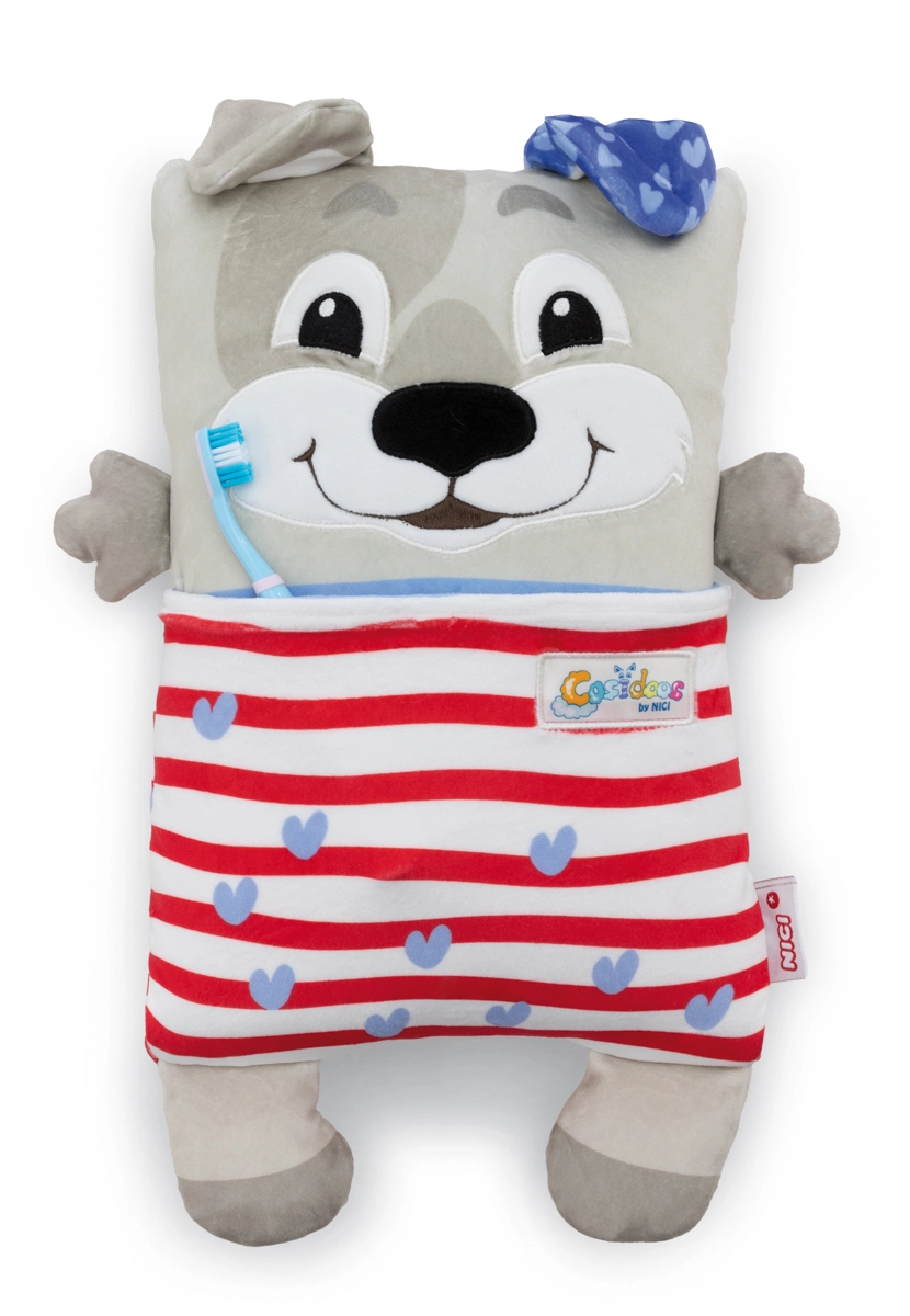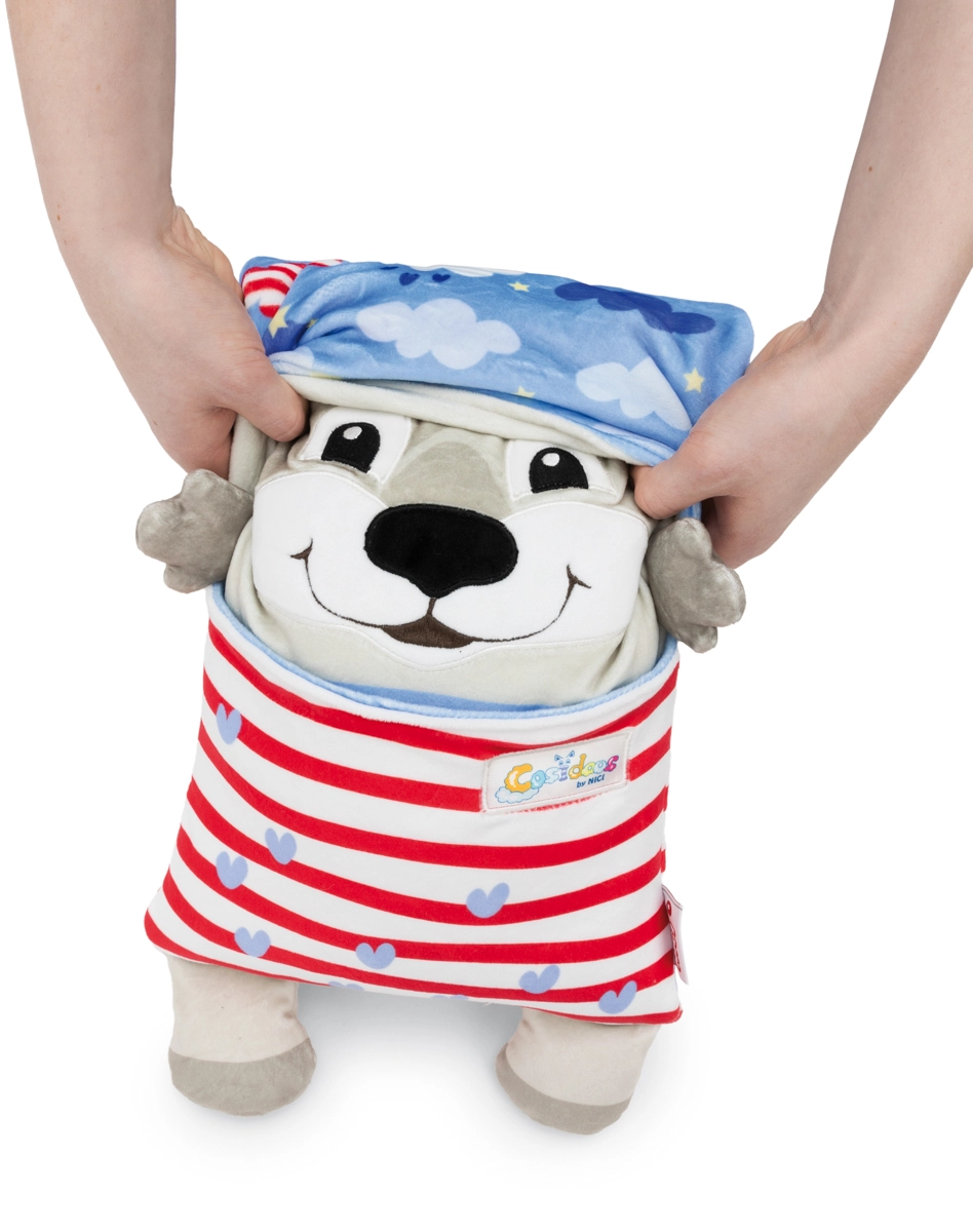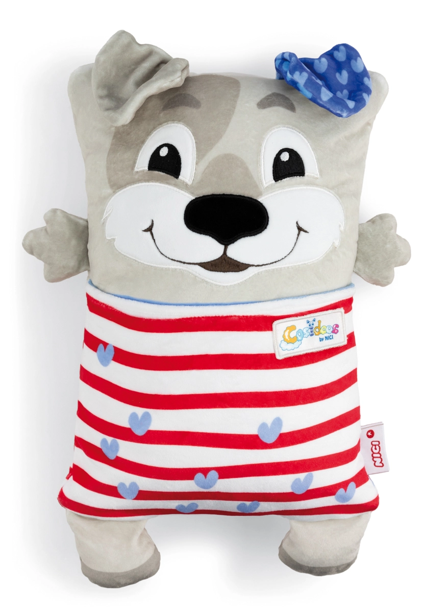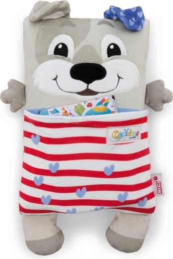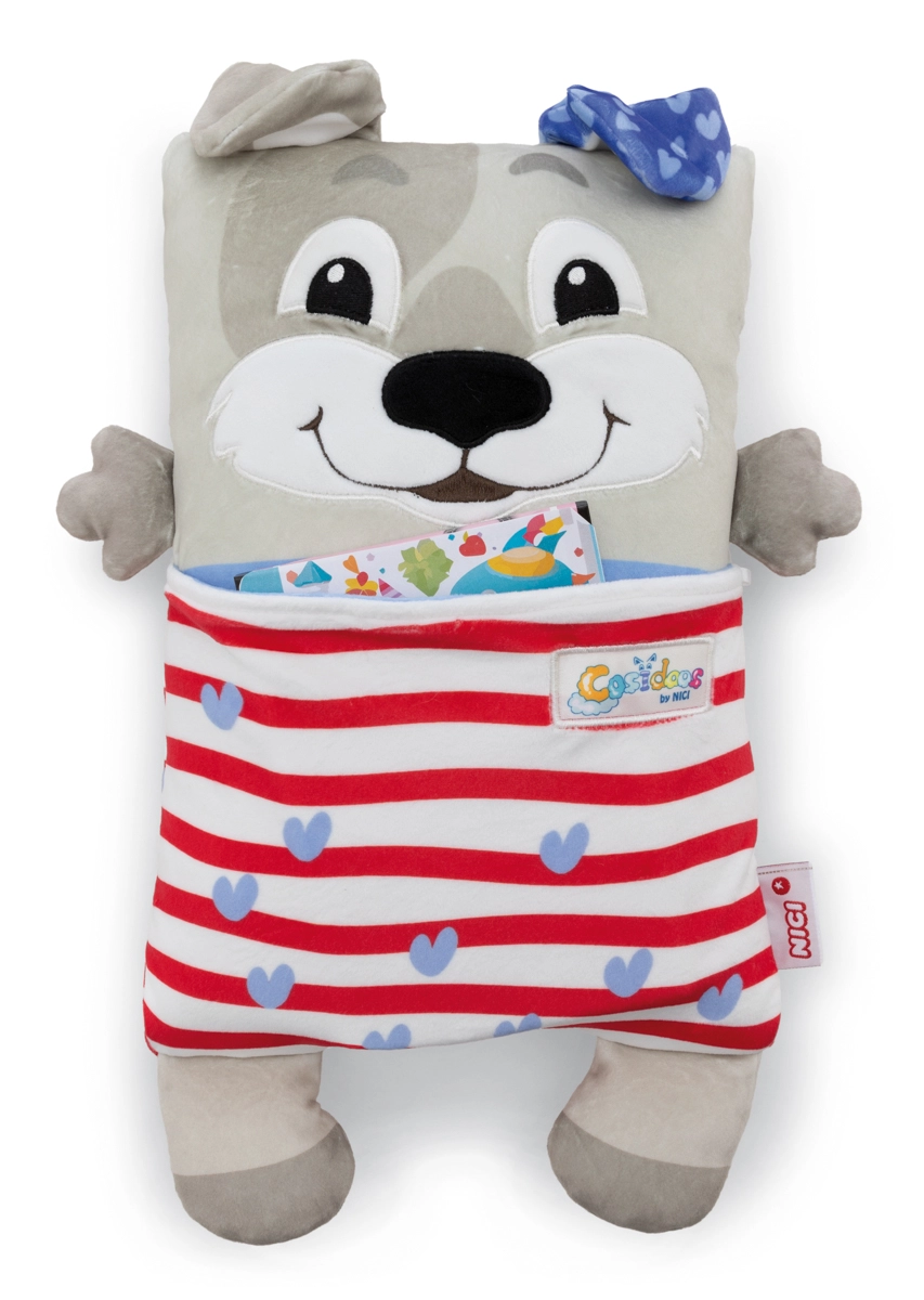 Ontdek de magie van de soepele overgang tussen spelen en uitrusten. NICI Cosidoos is een zachte hond met een grijs lijfje en een blauw oor, die met één omdraaiing verandert van een speelse metgezel in een heerlijk zacht kussentje met nachtelijk motief. Kinderen zullen dol zijn op zijn lieve uitdrukking, zachte materialen en kalmerende kleuren met wolkjes, sterren en een maantje.
