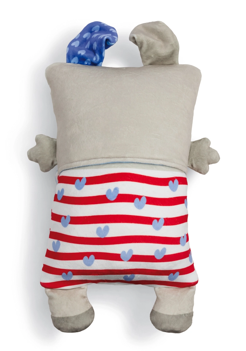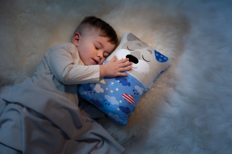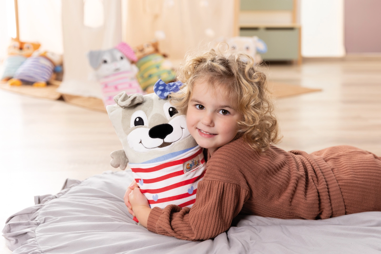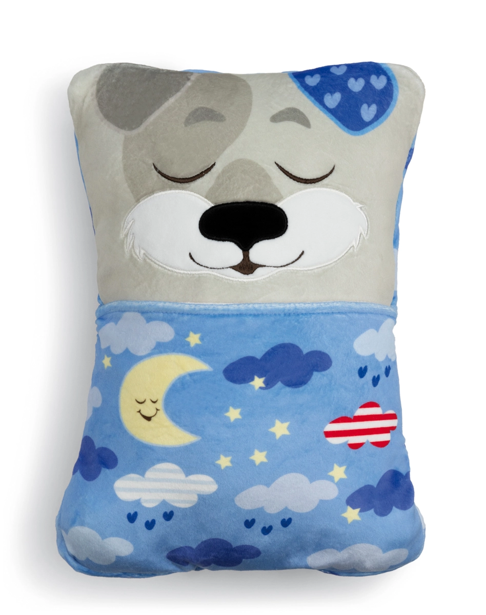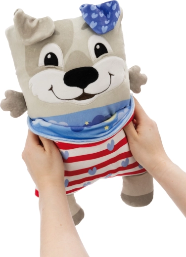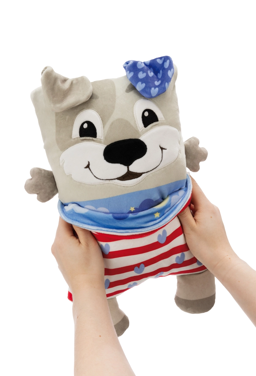 Met één eenvoudige omdraaiing verander je de vrolijke hond in een rustgevend nachtkussentje met wolkjes, sterren en een maantje. Het perfecte ritueel om makkelijker in slaap te vallen.