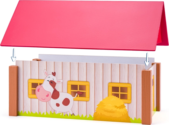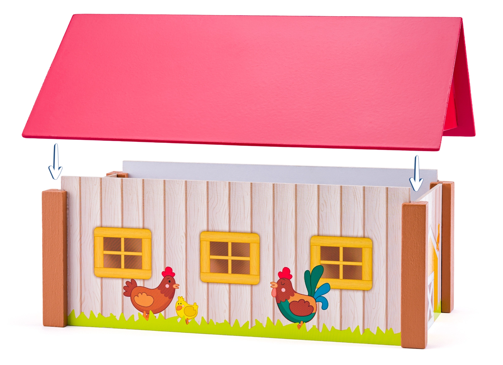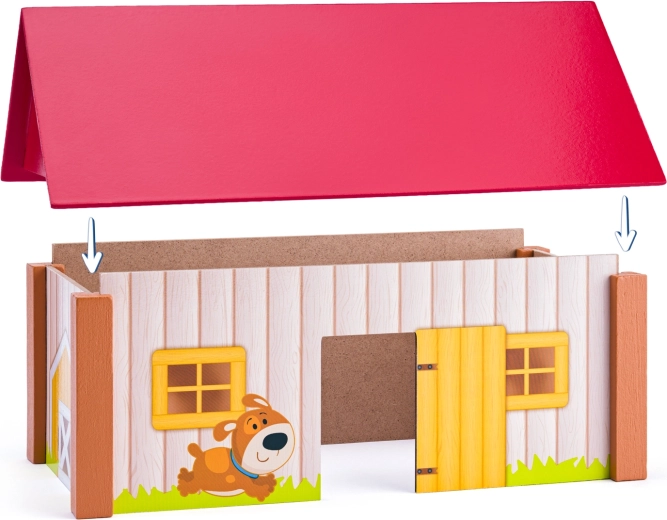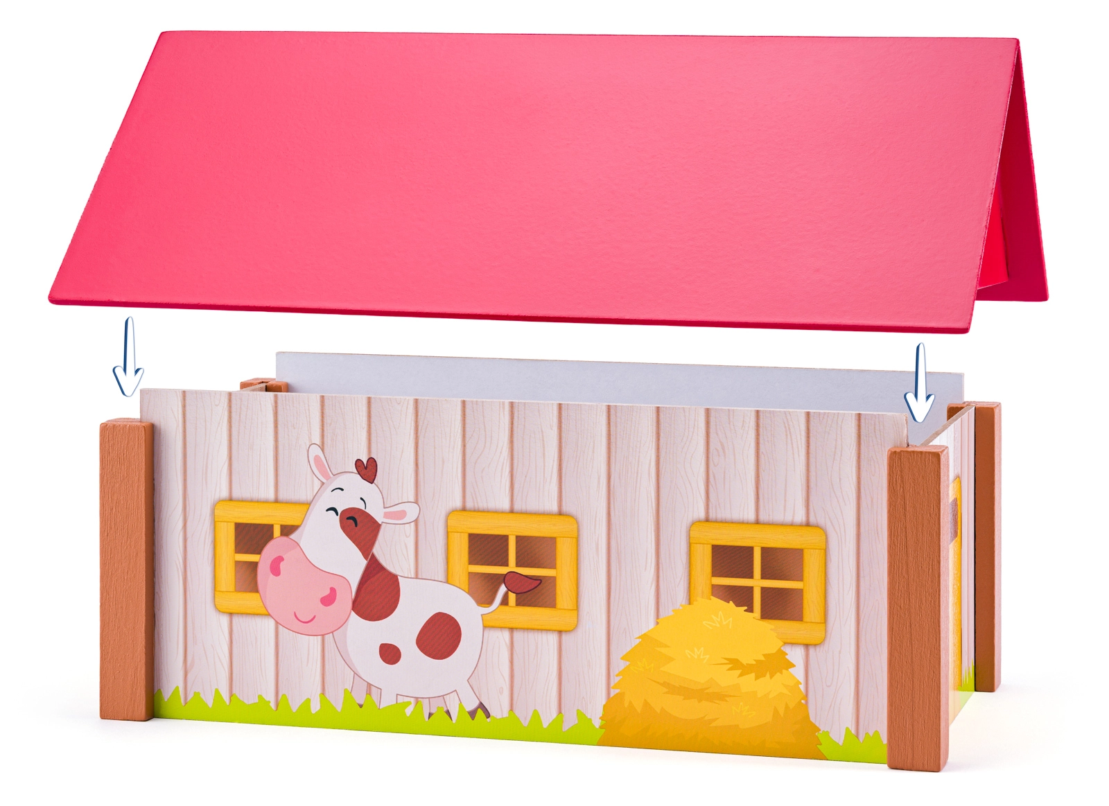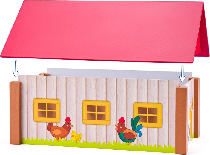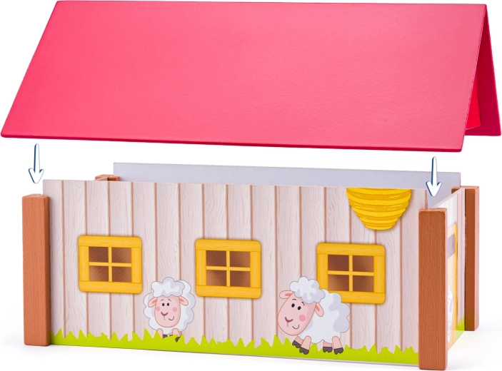 Ontdek de charme van het platteland met deze hoogwaardige houten set voor kleine boeren. De set biedt drie huisjes met afneembaar dak en een grote speelmat, die samen een kleurrijke, gedetailleerde boerderij vormen. Illustraties van een Tsjechische auteur, veilig afgeronde randen en duurzame materialen ondersteunen creatief en veilig spelen met figuurtjes.