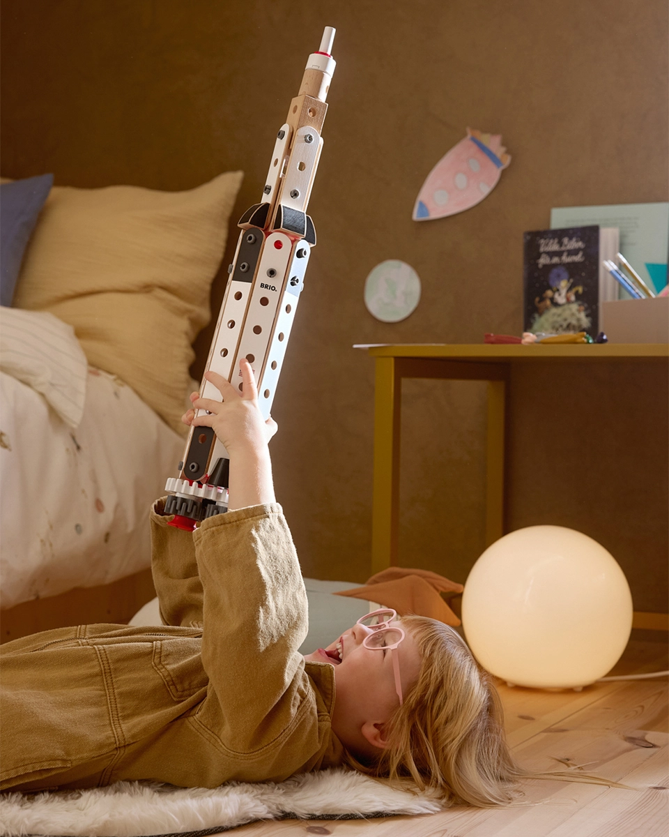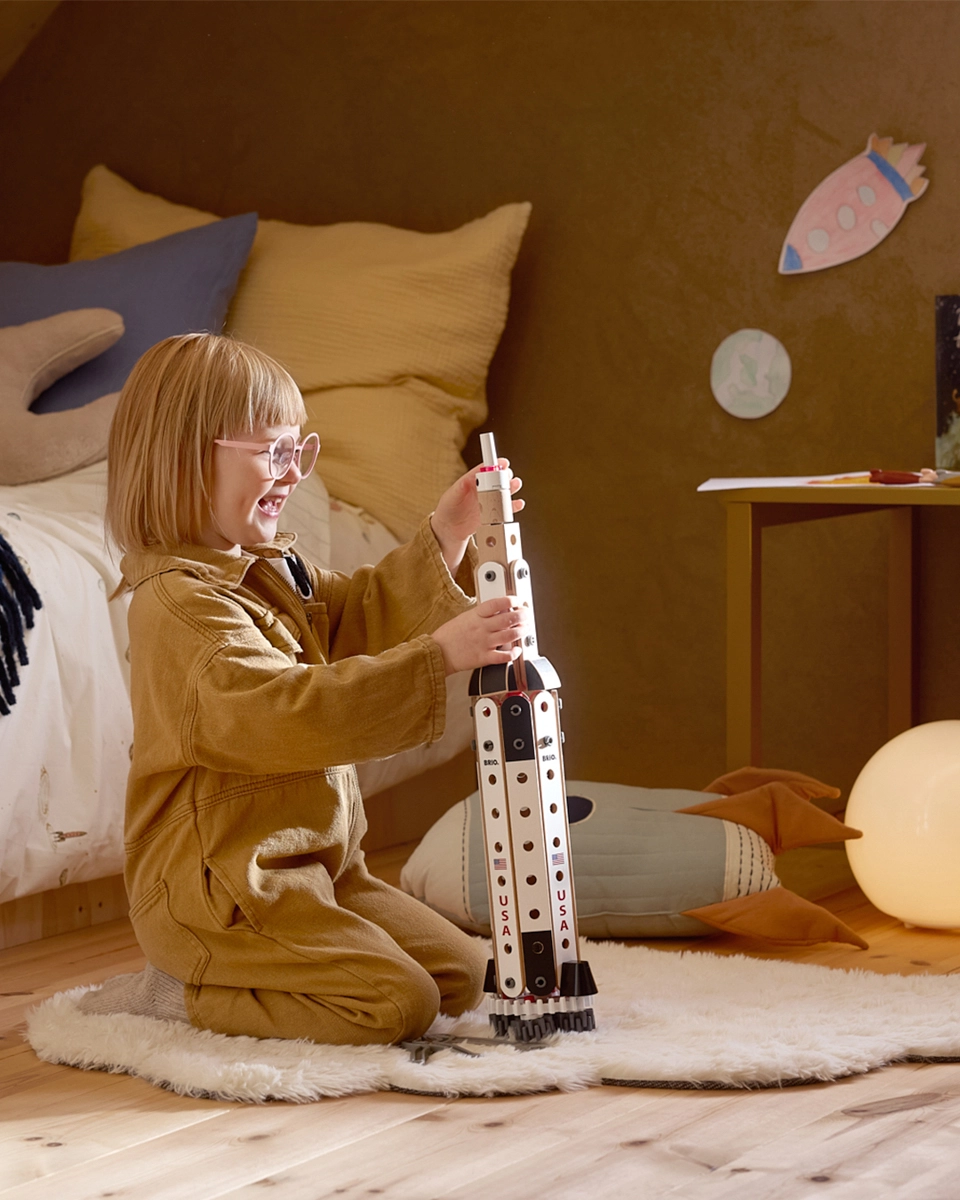 Ontdek de iconische NASA Apollo Saturn V als hoogwaardige bouwset van BRIO Builder. De robuuste combinatie van houten profielen en blokken met kunststof koppelingen, tandwielen en gereedschap stimuleert vrij spel, technische experimenten en fantasie. De driedelige raketconfiguratie met knipperende neus trekt kinderen mee in de wereld van ruimtevaart en verhalen over het veroveren van de kosmos.