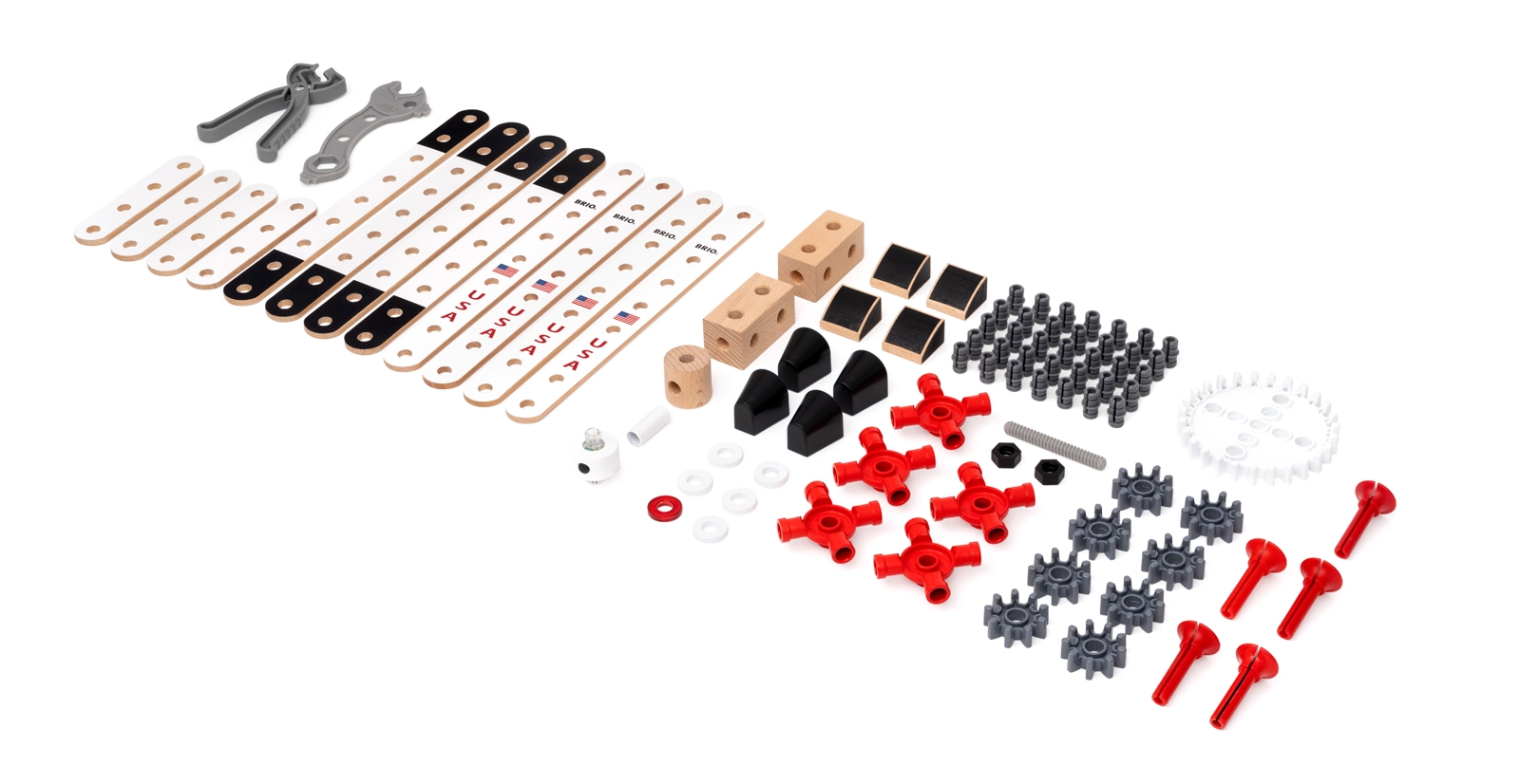 - 12× houten profiel, 11× houten blok, 9× tandwiel, 5× pen/verbinding, 1× licht, 1× tang, 1× sleutel, diverse speelelementen, 1× inspiratiefolder
