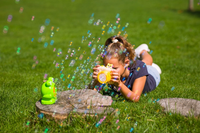 Het grote voorste mechanisme creëert meteen na het indrukken van de ontspanner een stroom van kleine belletjes. Kinderen zien de belletjes in een oogwenk en het plezier kan beginnen.