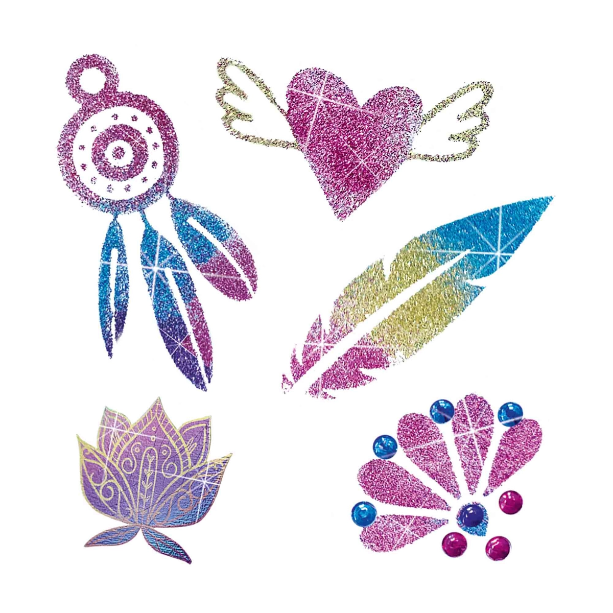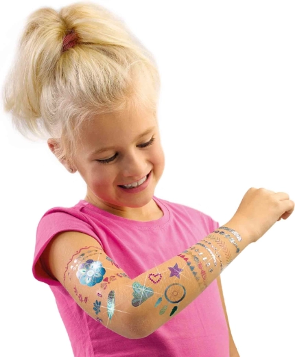 Creëer je eigen stijl met de luxe 3-in-1 tatoeageset, die metallic tijdelijke tatoeages combineert met transparante stickers om te bestrooien met glitters in 4 kleuren en huidlijm voor het schrijven van namen of het tekenen van je eigen motieven. Dankzij de diamanten steentjes geef je het resultaat extra glans en een feestelijke look.