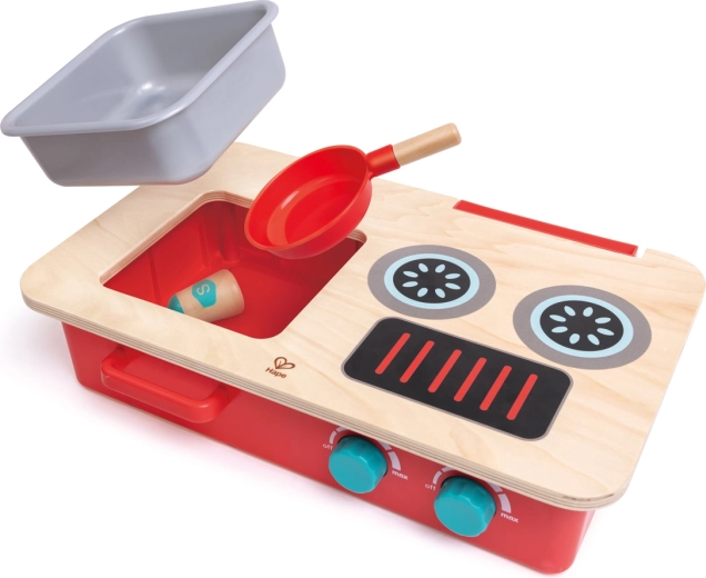 Inclusief een uitgebreide set accessoires: pan, spatel, bord, doek, twee kruidenpotjes en speel-etenswaren (worst, vis, vleesplak). De kwalitatieve houten constructie met een glad en veilig oppervlak zorgt voor een lange levensduur en eenvoudig schoonmaken na elk “feestmaal”.