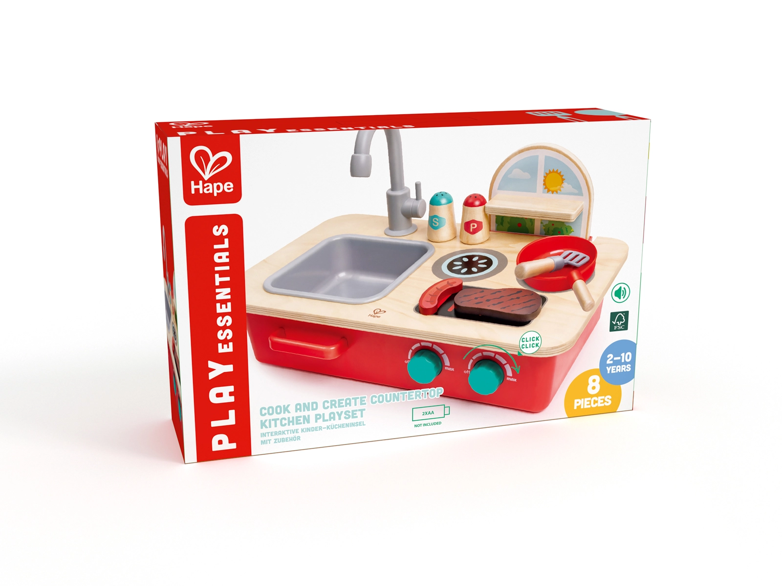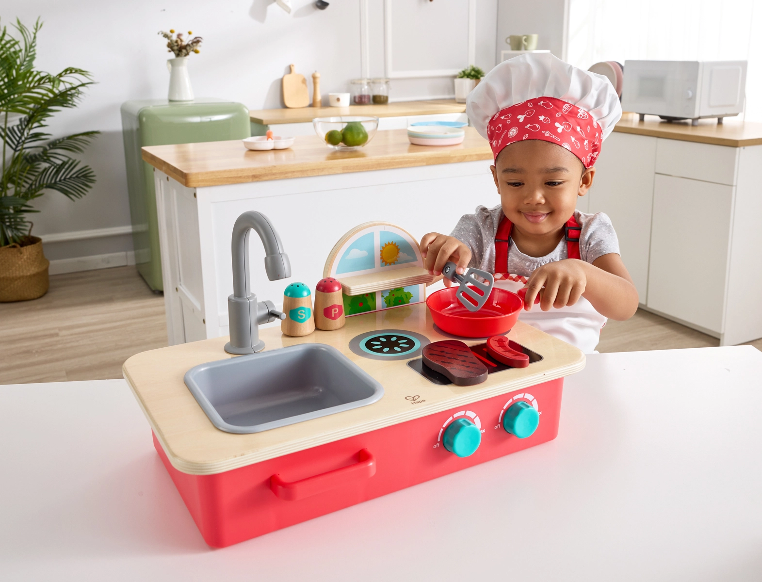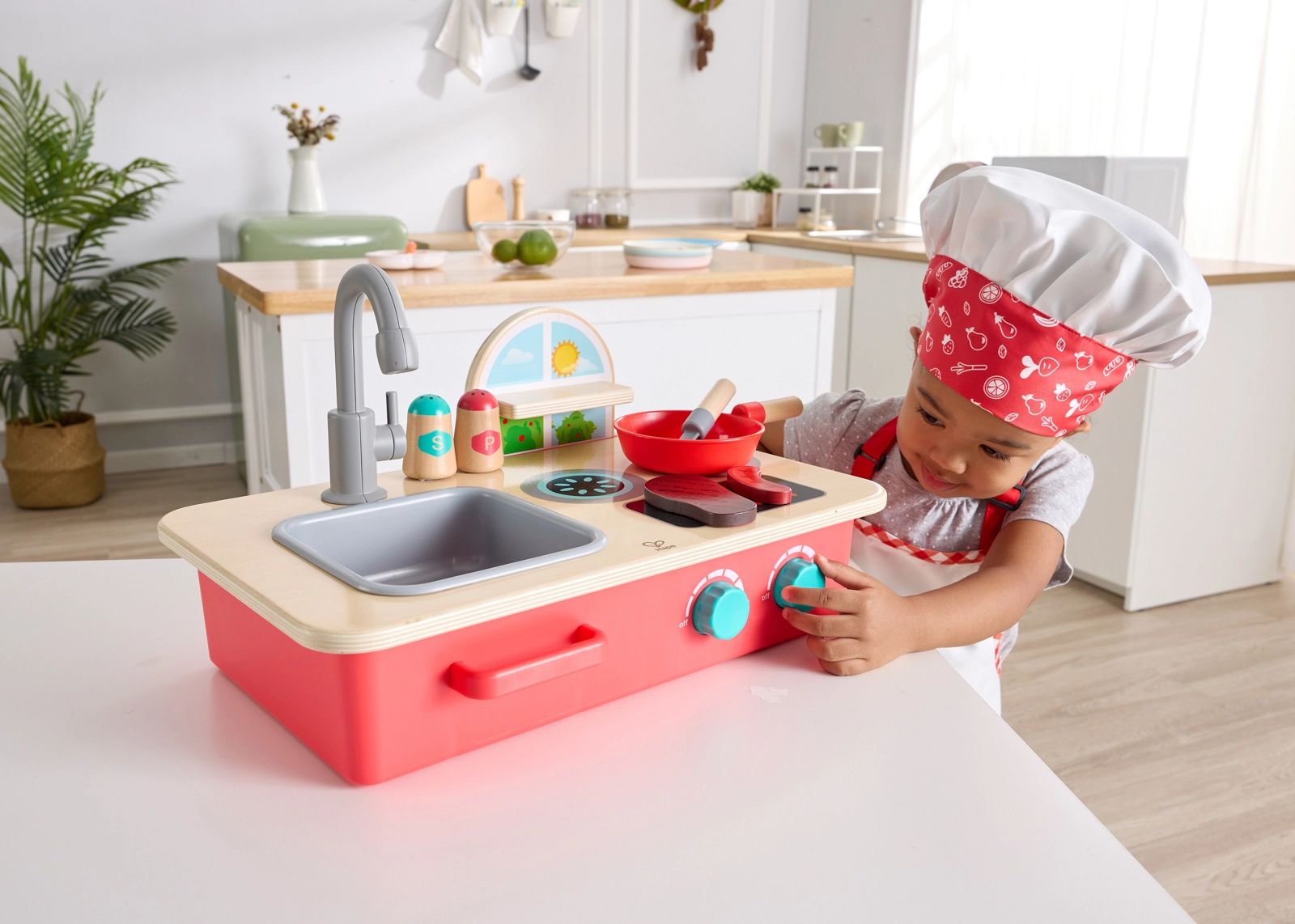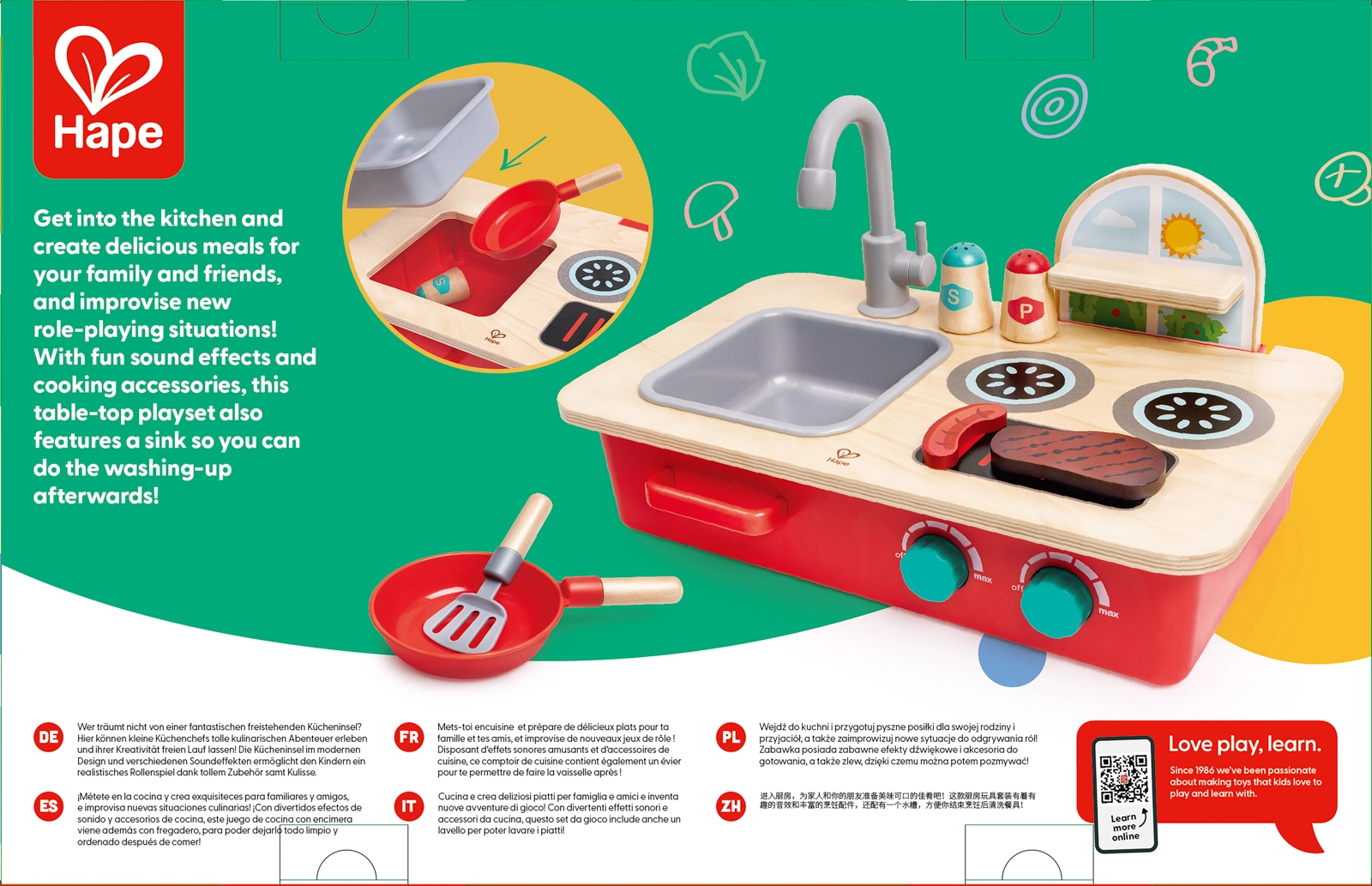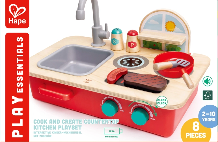 Ontdek het plezier van koken met het compacte tafelkeukentje Cook & Create. Kinderen genieten van twee kookzones met draaiknoppen en authentieke borrel- en sissende geluiden, een afneembare gootsteen met draaibare kraan en een praktisch kruidenrekje. Je zet het keukentje eenvoudig op tafel of op de vloer, zodat er overal gespeeld kan worden.