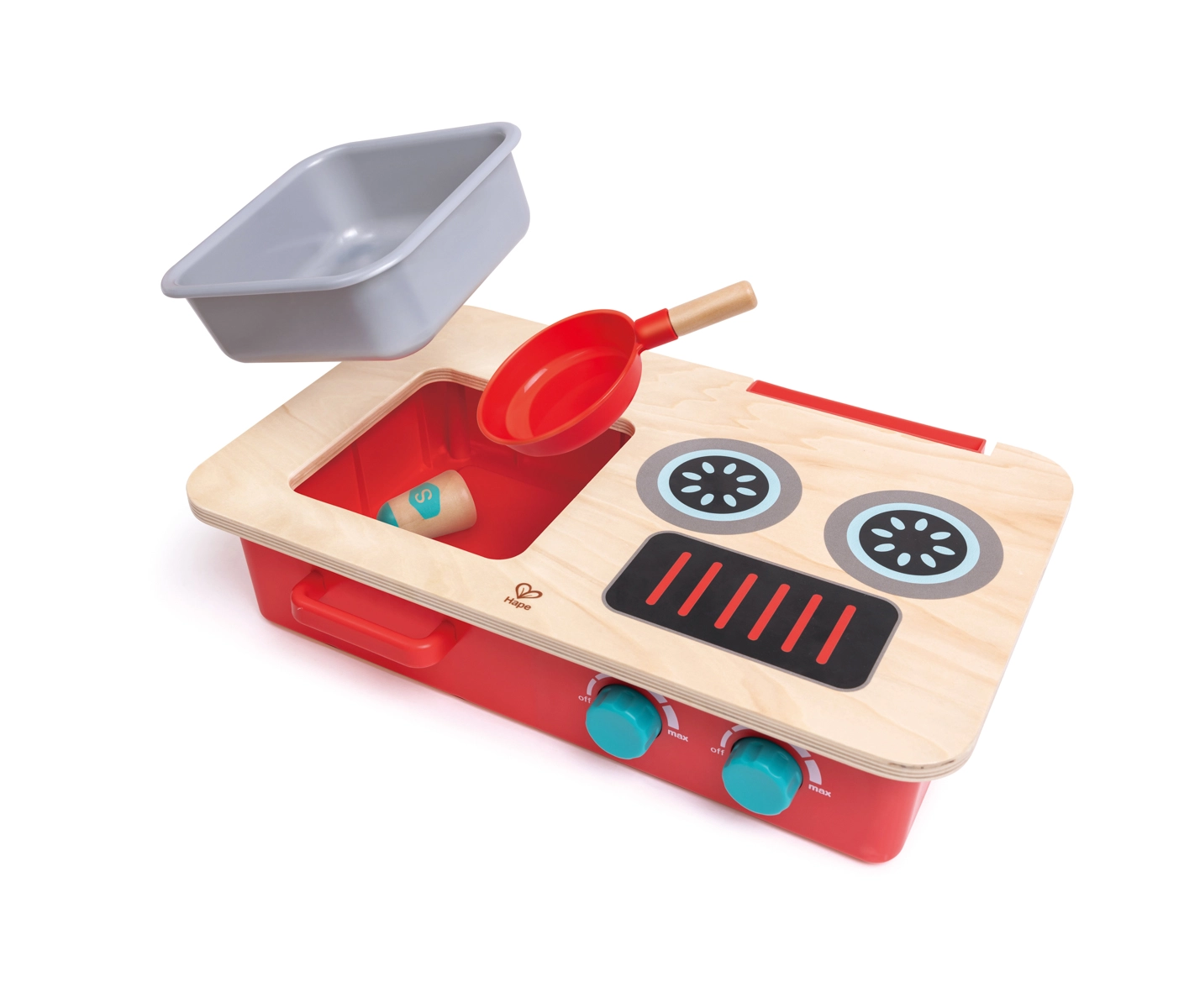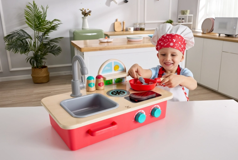 Draai aan de knop, zet de pan op de kookplaat en geniet van authentieke borrel- en sissende geluiden. Een startmelodie zorgt voor de sfeer van een echte keuken.