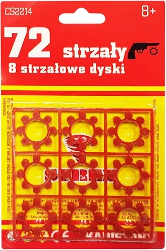 Geef kinderspel extra actie en een realistisch effect met kapjes op acht-schots schijfjes. In de verpakking vind je 9 schijven met elk 8 schoten, in totaal 72 schoten, die een echte knal creëren bij het afvuren van speelgoed. Geschikt voor kinderen vanaf 8 jaar.