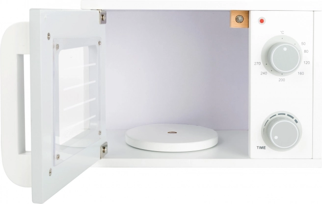 De houten magnetron voor kinderen van Small Foot biedt realistische details, zoals draaiknoppen voor temperatuur- en tijdsinstellingen, en een magnetische sluiting van de deur, die de verbeelding van kinderen tijdens het spelen stimuleert.
