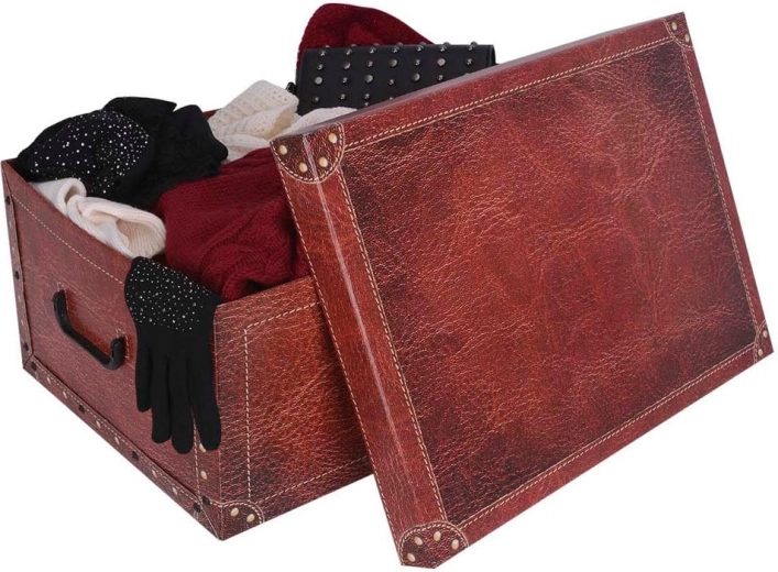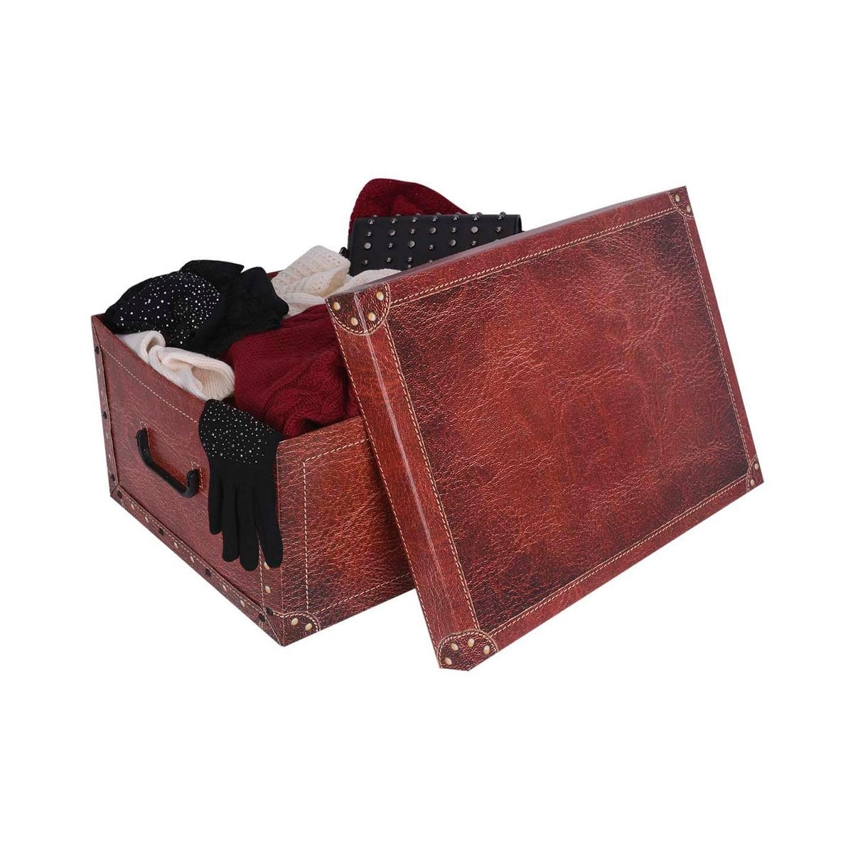 Elegante kartonnen box MAXI met leerlook en beslag in roodtinten, ideaal voor overzichtelijke opslag thuis en op kantoor. Gemaakt van 100% gerecycled karton, met een stevige constructie, eenvoudig te monteren zonder gereedschap en Italiaanse productie met FSC- en PEFC-certificering.
