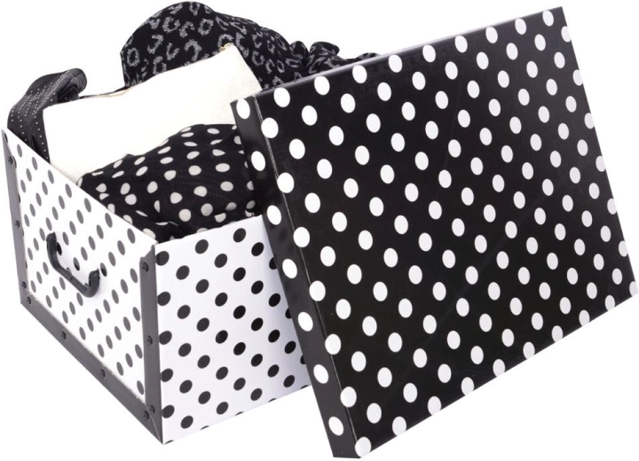 De MAXI opbergdoos combineert een tijdloos patroon met praktische details. Dankzij het duurzame gelamineerde karton houdt hij orde in huis, op kantoor en in de garderobe. Eenvoudige montage zonder gereedschap en comfortabele handgrepen voor dragen zorgen voor dagelijks gebruiksgemak.