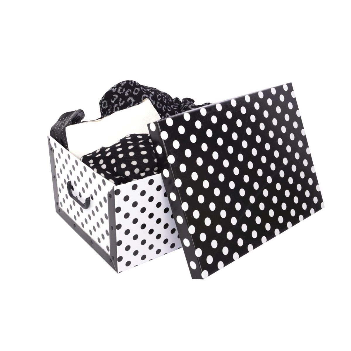 Stijlvolle opbergdoos MAXI in het design witte stippen op zwarte achtergrond met een elegante uitstraling, stevige constructie en gemaakt van 100% gerecycled karton. Eenvoudig te monteren zonder gereedschap, met Italiaanse kwaliteit en de certificeringen FSC en PEFC voor respect voor natuur en gezondheid.