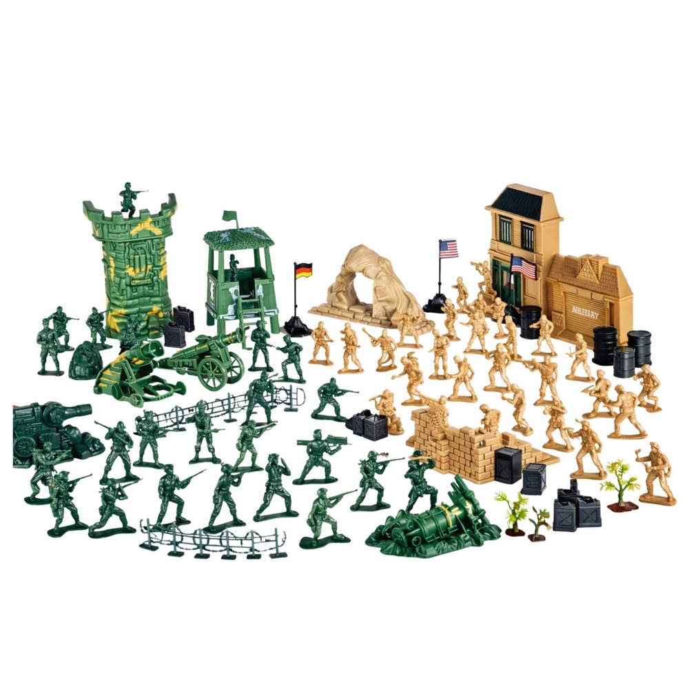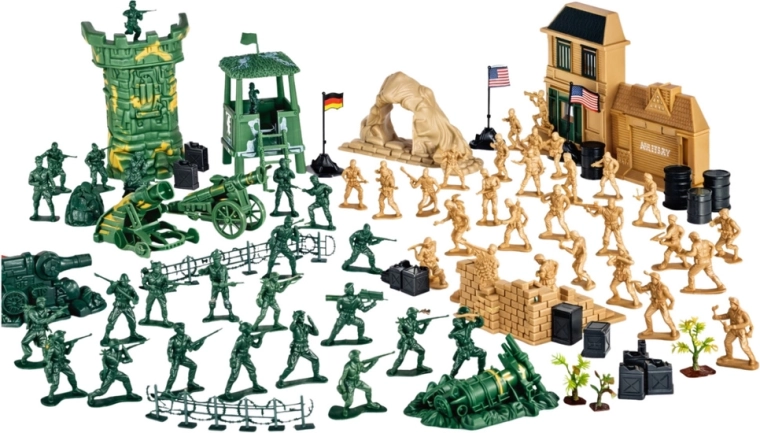 - Diverse figuren en accessoires: soldaten, voertuigen, kanonnen, wapens, barrières, vlaggen, hekken
