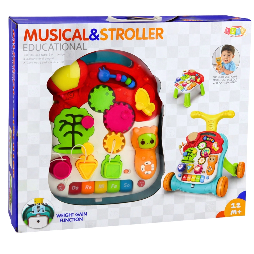 De ergonomische handgreep, rubberen wieltjes die de vloer niet beschadigen en de stevige constructie bieden zekerheid en veiligheid. De rijke uitrusting motiveert tot zelfstandig spelen en ontwikkelt de fijne en grove motoriek, cognitieve vaardigheden en zintuiglijke waarneming.