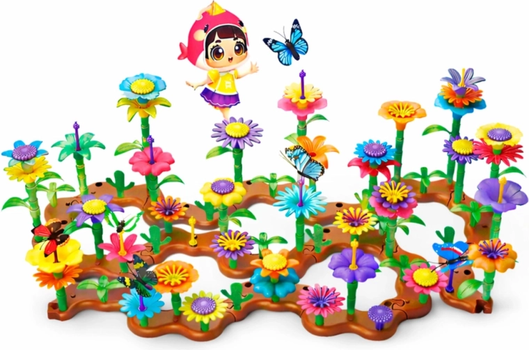 Deze kleurrijke bouwset geeft kinderen eindeloze ruimte voor fantasie. Ze vinden er stelen, bladeren, bloemkoppen, stampers en decoratieve vlinders en pad-elementen in, waarmee ze eenvoudig bonte perkjes, kransen en originele 3D-arrangementen bouwen. Elk kunstwerk kan anders zijn, waardoor het spel niet snel verveelt.