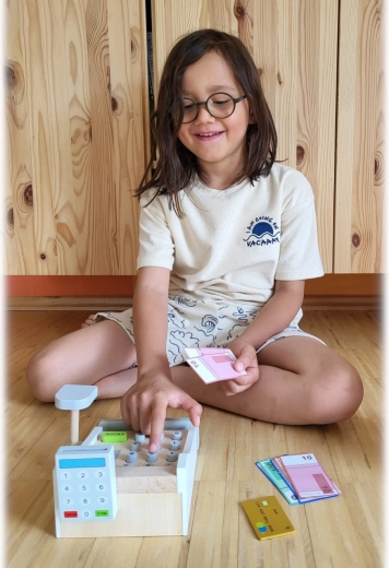 Bevat speelbiljetten en een houten creditcard – ideaal om basisbewerkingen, prijzen en betaalsituaties te oefenen.
