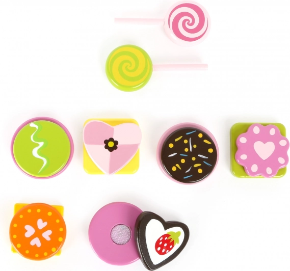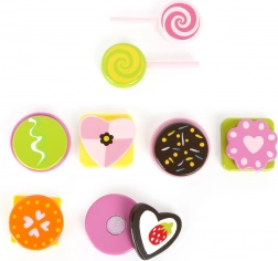 Wie kan dit weerstaan? Deze kleurrijke set zoetigheden van 100% FSC-hout verrast met lollies, koekjes en pralines die dankzij klittenbandsluitingen steeds opnieuw uit elkaar gehaald en weer in elkaar gezet kunnen worden. Een geweldige aanvulling op de kinderkeuken die de fijne motoriek stimuleert en eindeloos speelplezier biedt.