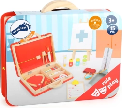 Deze hoogwaardige houten reddingsset in een koffer is ideaal voor doktersrollenspellen. Dankzij de rijke uitrusting en functionele elementen, zoals pompjes op spuiten en dispensers, kunnen kinderen poppen en knuffels realistisch verzorgen, de bloeddruk meten en alles noteren in hun eigen medische documentatie.