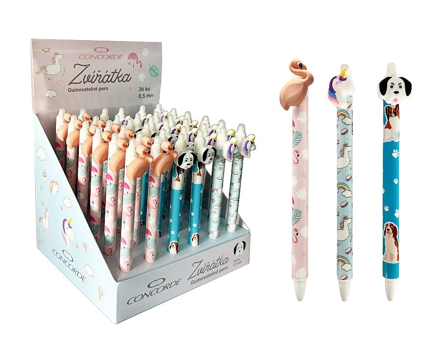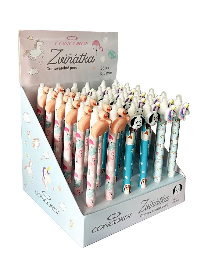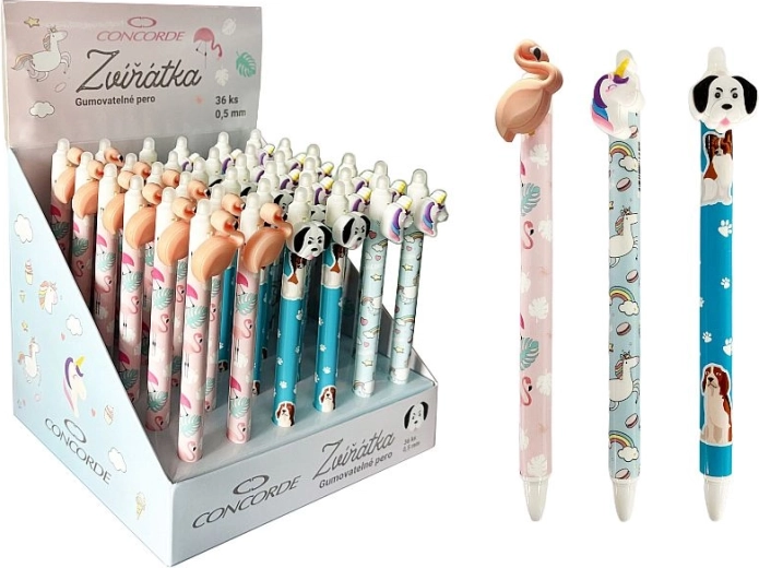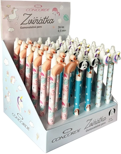 De schattige en praktische uitgumbare gelpen CONCORDE Diertjes is ideaal voor school en kantoor. Dankzij de geïntegreerde gum aan het uiteinde van de pen kun je geschreven tekst gemakkelijk uitwissen en direct overschrijven zonder het papier te beschadigen. Aantrekkelijke pasteltinten en dierenthema’s (flamingo, hondje, eenhoorn) maken zowel kinderen als volwassenen blij. De fijne punt van 0,5 mm en de blauwe inkt zorgen voor schoon en precies schrijven.