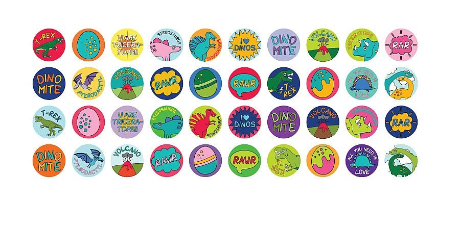 De set bevat 160 stickers in de stempel en 160 in de navulling – genoeg dinomotieven voor school, thuisprojecten en beloningen.