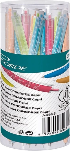 Stijlvolle balpen CONCORDE Capri in levendige kleuren biedt een elegante, extra fijne lijn van 0,6 mm en blauwe olie-inkt voor soepel schrijven. Voorzien van een drukmechanisme, transparante clip en een origineel zwaluwmotief. Geleverd als mix van vier kleuren in een praktische pot van 24 stuks.