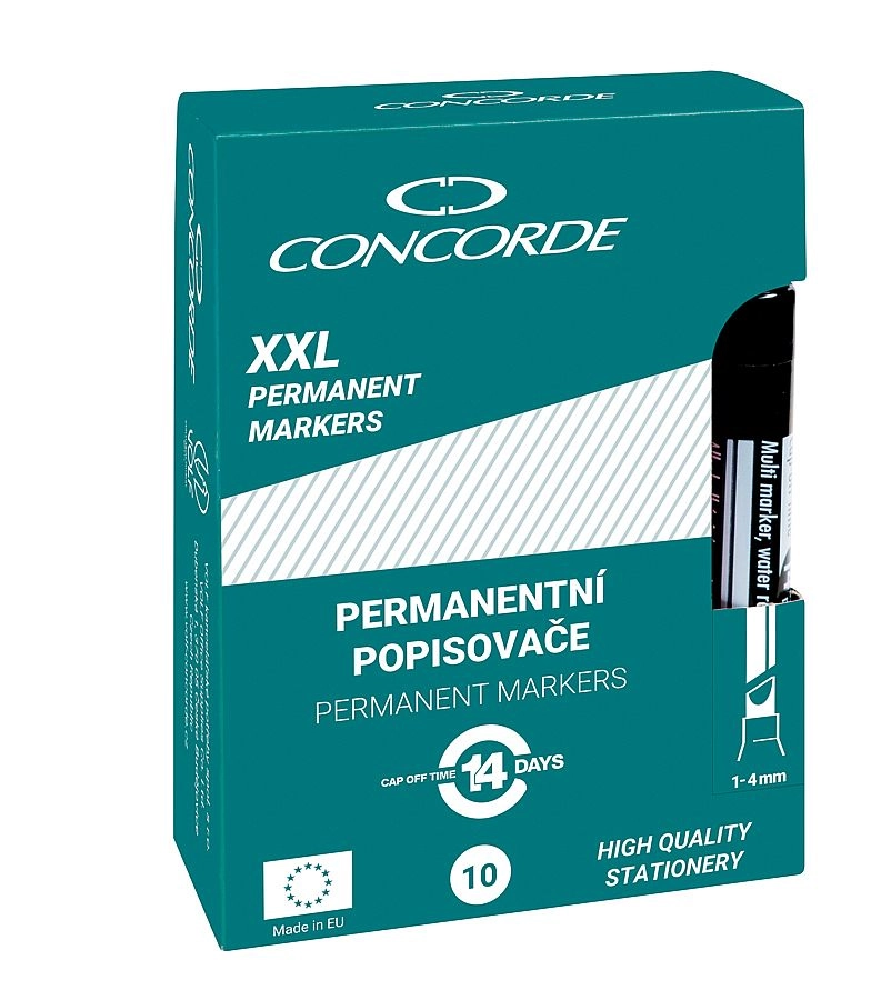 Universele permanente marker CONCORDE met dekkende inkt op alcoholbasis voor betrouwbaar markeren op folies, glas, kunststoffen, hout en metaal. Biedt een onuitwisbare en waterbestendige markering, ronde punt 3 mm en uitzonderlijke uithouding – tot 14 dagen zonder dop zonder uit te drogen.