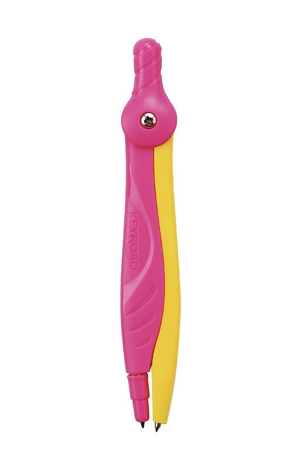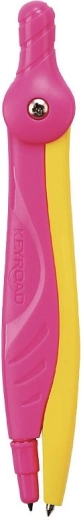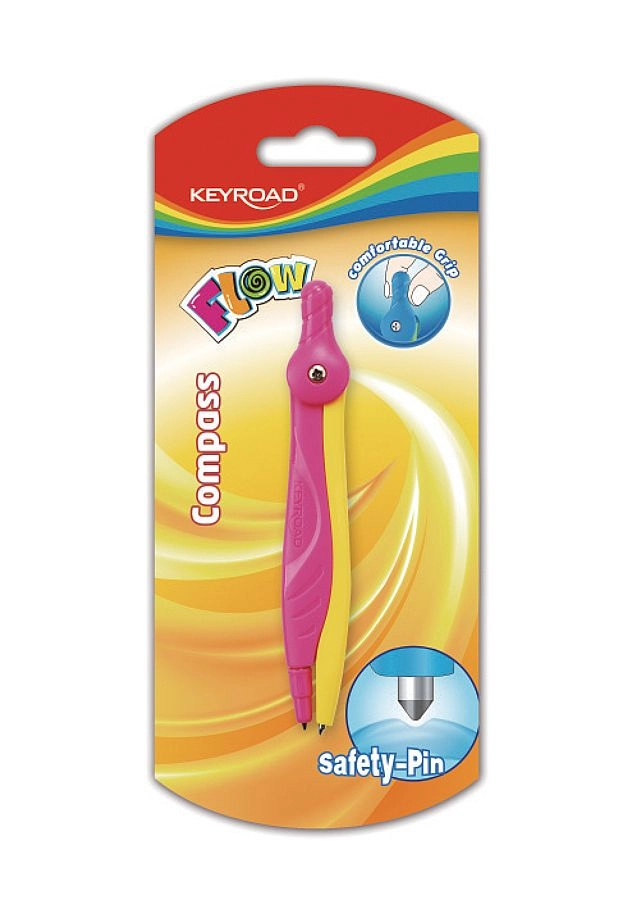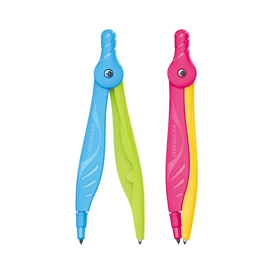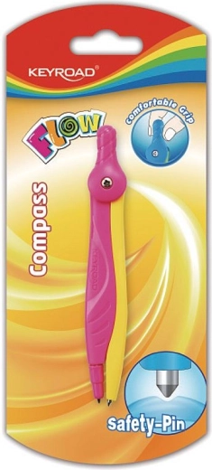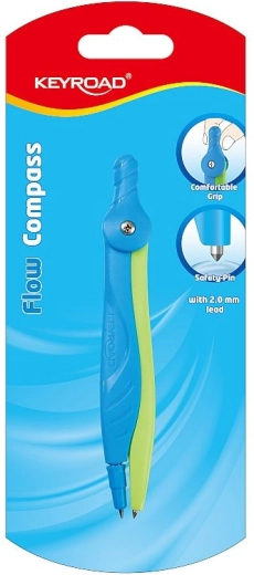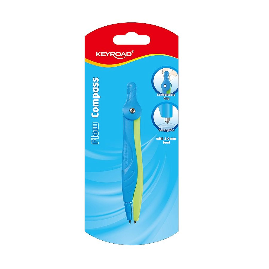 Praktische schoolpasser KEYROAD Flow voor precieze cirkels en bogen. Biedt een comfortabele ergonomische grip, een veiligheidsnaald voor veiliger gebruik en een aantrekkelijke tweekleurige uitvoering. Geleverd op blister in een assortiment van twee kleuren.