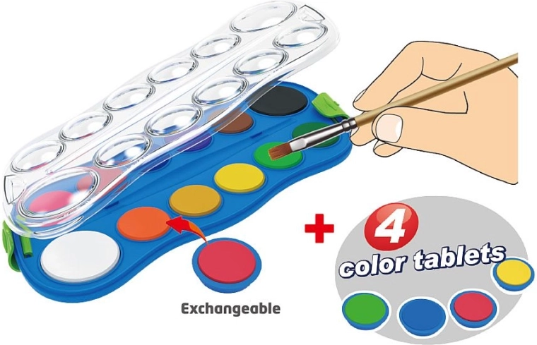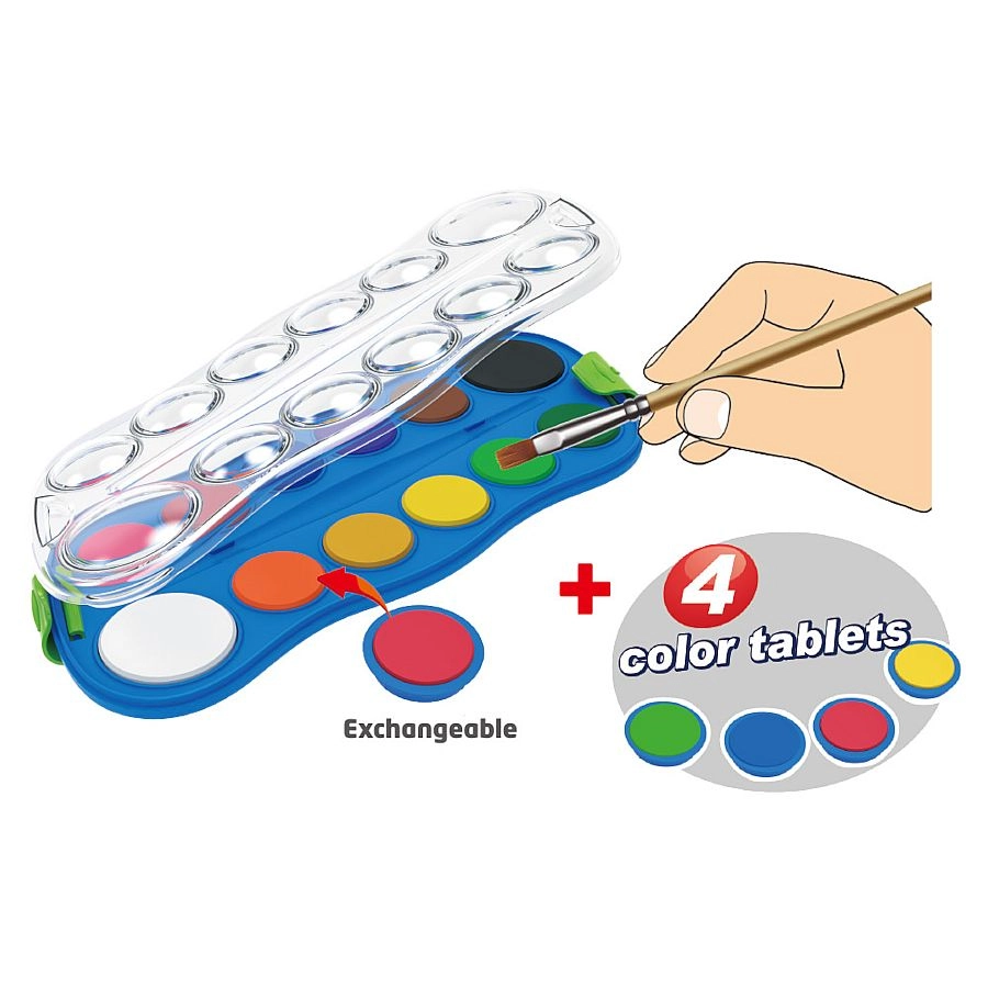De verpakking bevat 12 basiskleuren aangevuld met 4 verwisselbare kleuren, die je palet aan mogelijkheden uitbreiden. De verven zijn gemakkelijk aan te brengen, mengen goed en zijn geschikt voor papier en waterverftechnieken.