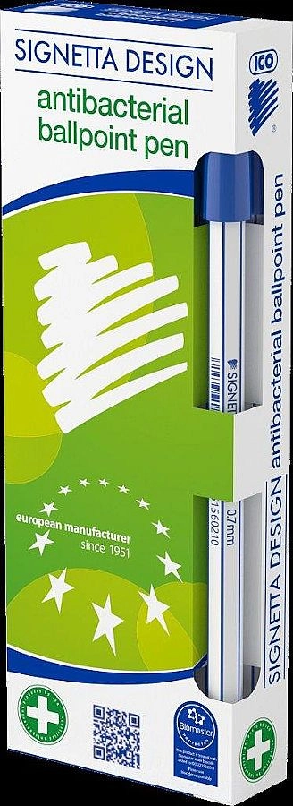 De antibacteriële balpen ICO Signetta is een ideale keuze voor kantoor, school en recepties, waar de pen door meerdere gebruikers wordt gedeeld. Een speciale mix met zilver-nanodeeltjes is direct geïntegreerd in het penmateriaal, waardoor het de bacteriegroei op het oppervlak beperkt en helpt een hoger hygieneniveau te behouden bij dagelijks gebruik.
