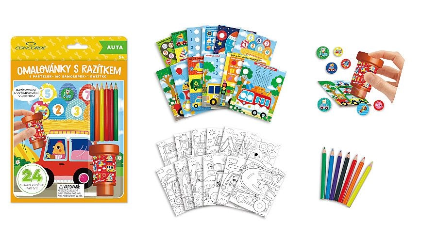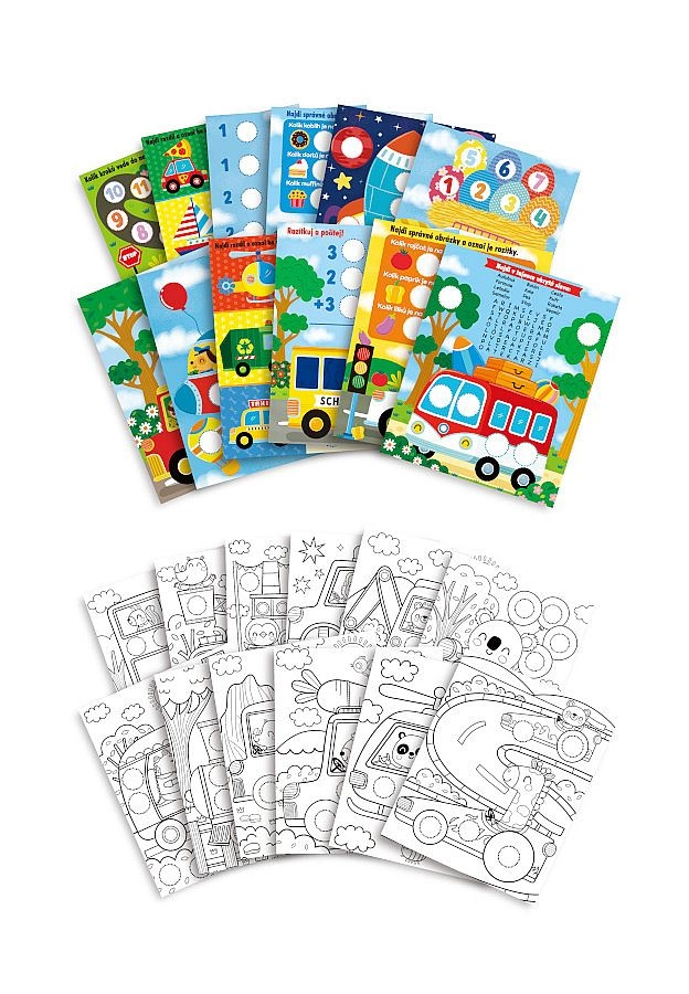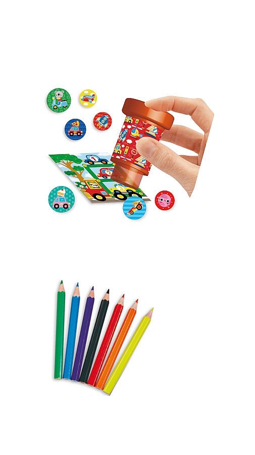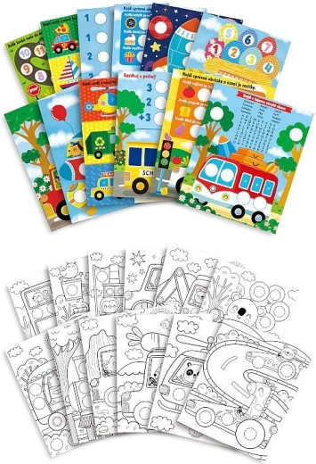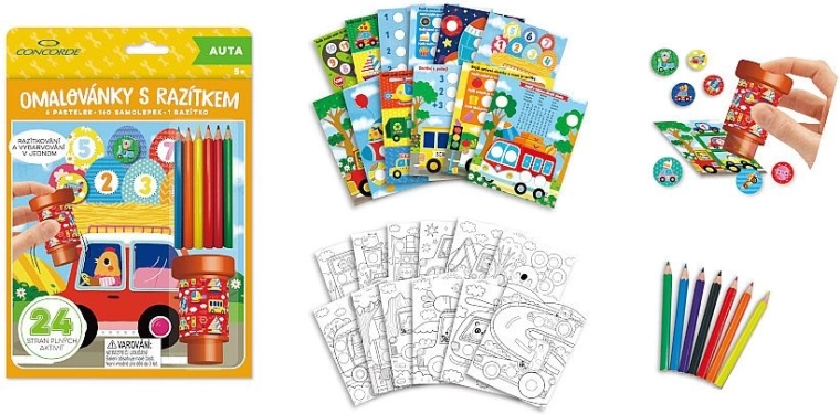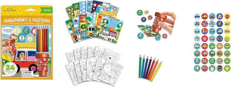 De set bevat 24 pagina’s vol plezier – 12 pagina’s met eenvoudige opdrachten en 12 pagina’s om in te kleuren. Het pakket wordt aangevuld met 160 gemakkelijk los te maken stickers met autothema, 1 stempel voor originele afdrukken en 6 gekleurde potloden voor direct knutselplezier.