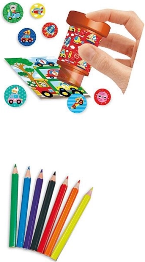 Ontdek een creatieve set die stempelen en kleuren combineert in één leuk pakket. Het bevat 24 pagina’s met activiteiten (12 opdrachten en 12 kleurplaten), 160 stickers met autothema, 1 stempel en 6 kleurpotloden – alles wat kinderen nodig hebben voor uren creatief plezier.