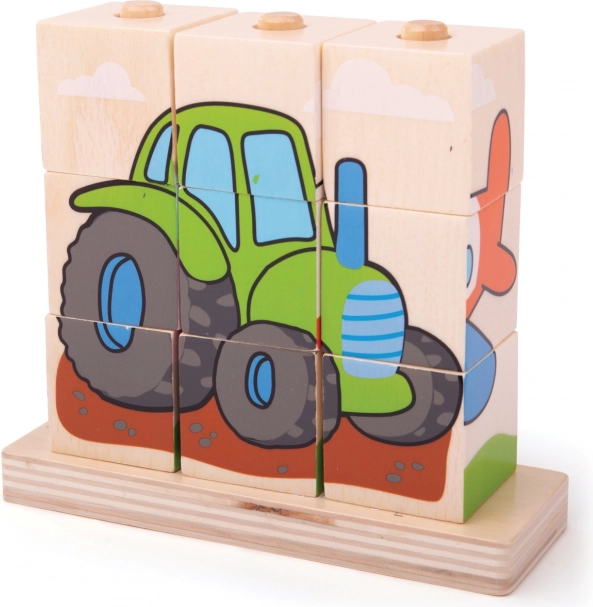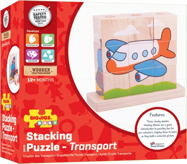 Houten puzzel Bigjigs Baby Vervoersmiddelen is het ideale speelgoed voor het ontwikkelen van motorische vaardigheden en hand-oog coördinatie bij kinderen. Bevat 10 stukken houten blokken met vier vervoersscènes: trein, auto, tractor en vliegtuig.
