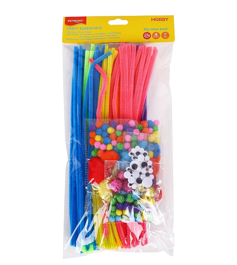 Praktische set met pompons, chenilledraden en zelfklevende wiebeloogjes in veel kleuren en maten. De ideale start voor tientallen creatieve ideeën.